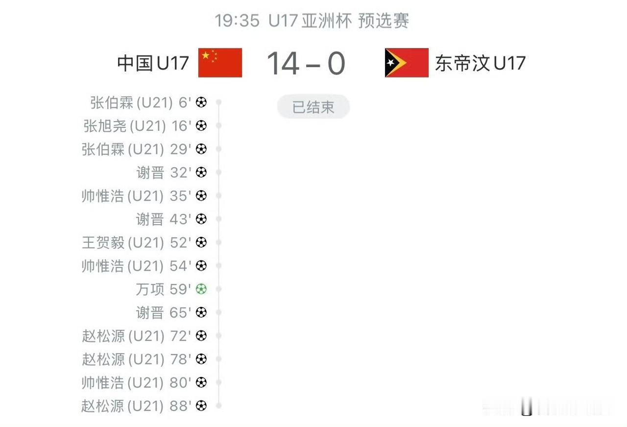 U17国足14比0东帝汶U1714球大胜!U16国青小将在亚洲杯预选赛A组第二轮火力全开,轻松击败东帝汶队,豪取两连胜锁定小组第一!或许对手实力有差距,但每一脚射门、每一次奔跑都藏着少年们的拼劲与热爱。不骄不躁,稳步前行,中国足球的未来,就靠你们踏实地闯!加油,少年们!爆料 U17亚洲杯谢晋表现如何