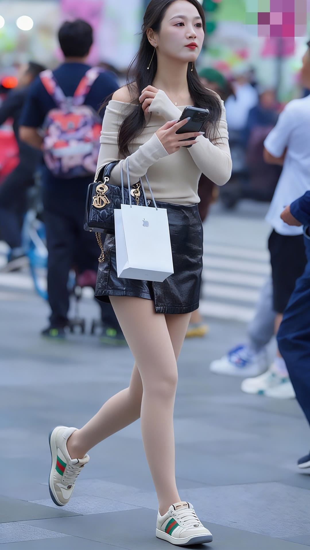 露肩针织衫软fufu贴肤,漆皮短裙一搭,甜飒感直接拉满~小白鞋的红绿条和包包偷偷呼应,连Apple袋子都成了时髦外挂!