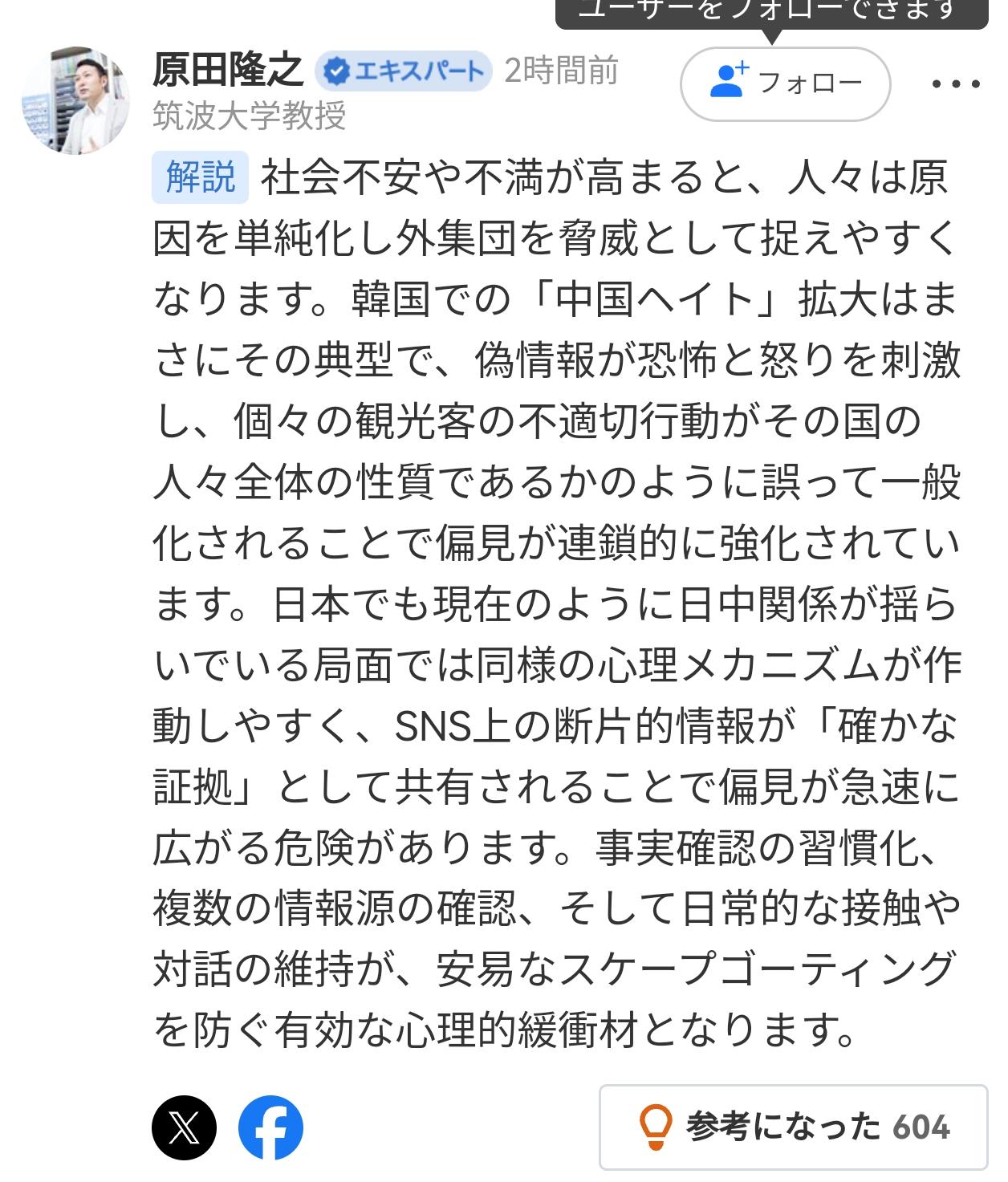 各国媒体都喜欢干一件事,把自己的对手描绘成所有人的敌人,以此证明自己采取敌对行为的正当性。日本共同社报道,韩国的FH思想正越发扩散,首尔在22日再度爆发FH游行。乍看之下,给人以日韩都与我们关系僵化的感觉,实际上所谓的首尔FH游行只是个300人参加的闹剧,而那些FH的思想传递更多是建立在虚假信息的传播上。在李在明政府的主导下,修复对华关系才是韩国的主流思想,中韩关系不说很好,起码整体上是向好发展的。 共同社的报道引起了广泛讨论,4000余条评论中,置顶的是筑波大学教授原田隆之的观点。他认为随着社会矛盾的加剧,人们容易把事情简单化,那就是把所有问题都归咎于外来因素,韩国的FH思潮正是建立在这个基础上的。《韩民族日报》写的更直白,它直言韩国某些政党或政治人物为了政治利益,非常善于挑动人民的对外情绪,比如被检方追加起诉“外患罪”的尹锡悦。为了清理政敌,其直接宣布戒严,而为了使戒严合法化,其在24年10-11月期间使用无人机在平壤散发传单,希望以此挑起朝韩对立,甚至局部战争。 但原田隆之的观点并不被日本网民广泛接受,总计只有600余人点赞认可。更受日本网民认可的是获得6.7万点赞的一则回复。其认为FH事出有因,日韩充斥着太多的不文明、犯罪和非法移民。这种观点有一定道理,但把这些和FH思想结合起来是站不住脚的。我们的人在日韩违反法律,会受到当地法律的制裁,我们也支持当地的法律制裁那些犯罪分子,我们的人在日韩当地并没有享受超国民待遇。而真正享受超国民待遇的是美国人,但我们却从没在日韩看到过真正的反美思潮,不管民间还是政界,亲美都是主流。 其实所谓的FH思潮之所以盛行于日韩,主要原因还是我们逐渐变强了,开始挤压他们的生存空间了。但我们又不够强,起码还没强到让他们不敢生出FH思想的程度!
