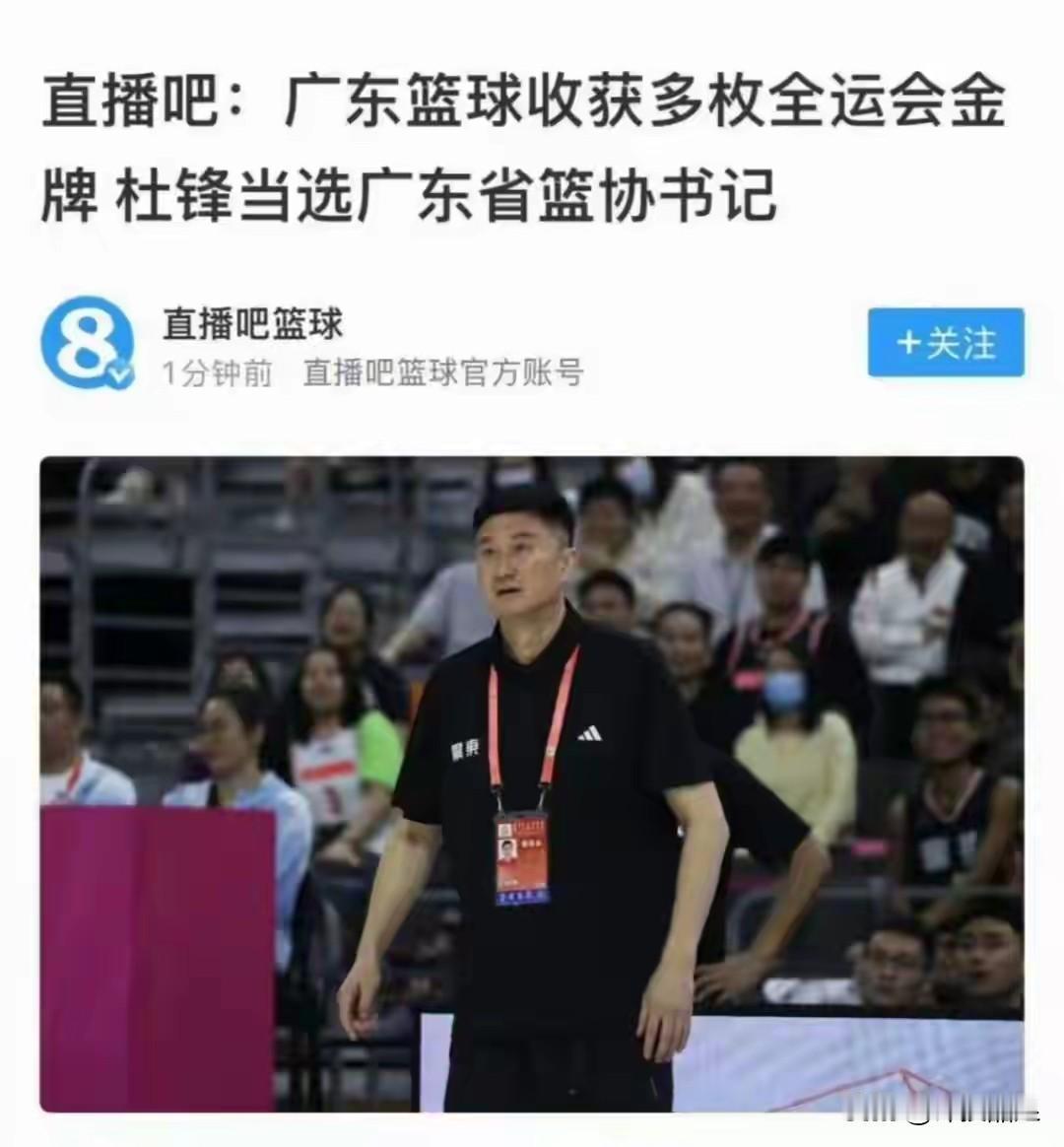 广东成年男篮:全运冠军 广东成年女篮:全运冠军 广东U22男篮:全运冠军 广东U18男篮:全运冠军 广东篮球在十五运成绩耀眼,拿到了4枚全运金牌。 媒体人付政浩说:“杜锋不仅是男篮成年组夺冠的主要功勋,也是广东篮球大获全胜的幕后功臣。” 最新的消息,杜锋日前当选为广东省篮球协会书记。付政浩这句话揭示了杜锋晋升的深层逻辑。名记解读,杜锋在全运会期间辗转于各个赛场,协调不同俱乐部之间的关系,其实已经在履行广东篮协书记的职责。新职位是对杜锋工作的极大肯定,CBA联赛新赛季,广东宏远争冠的目标更明晰了。