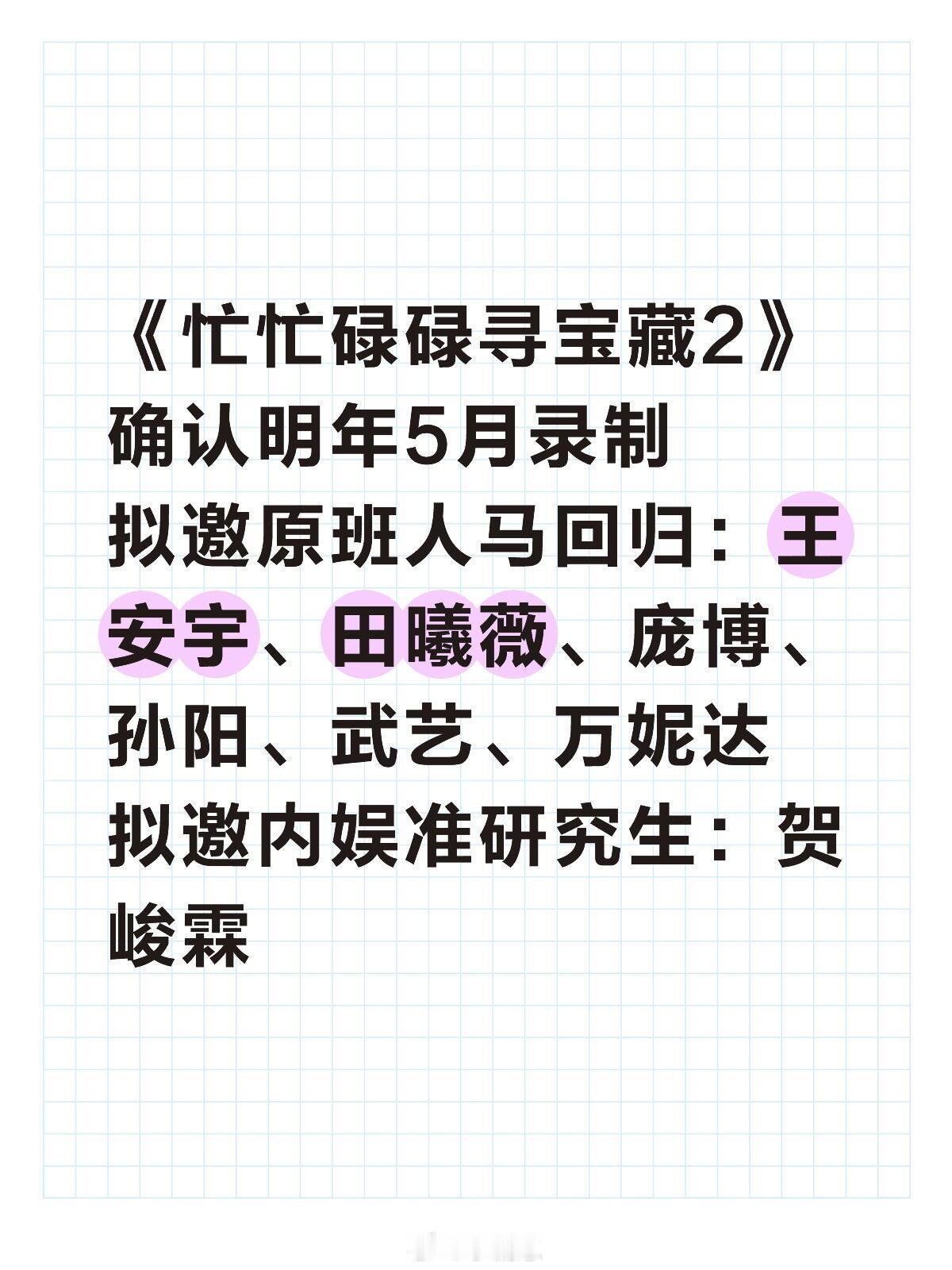 《忙忙碌碌寻宝藏2》确认明年5月录制拟邀原班人马回归:王安宇、田曦薇、庞博、孙阳、武艺、万妮达拟邀内娱准研究生:贺峻霖忙忙碌碌寻宝藏2‖