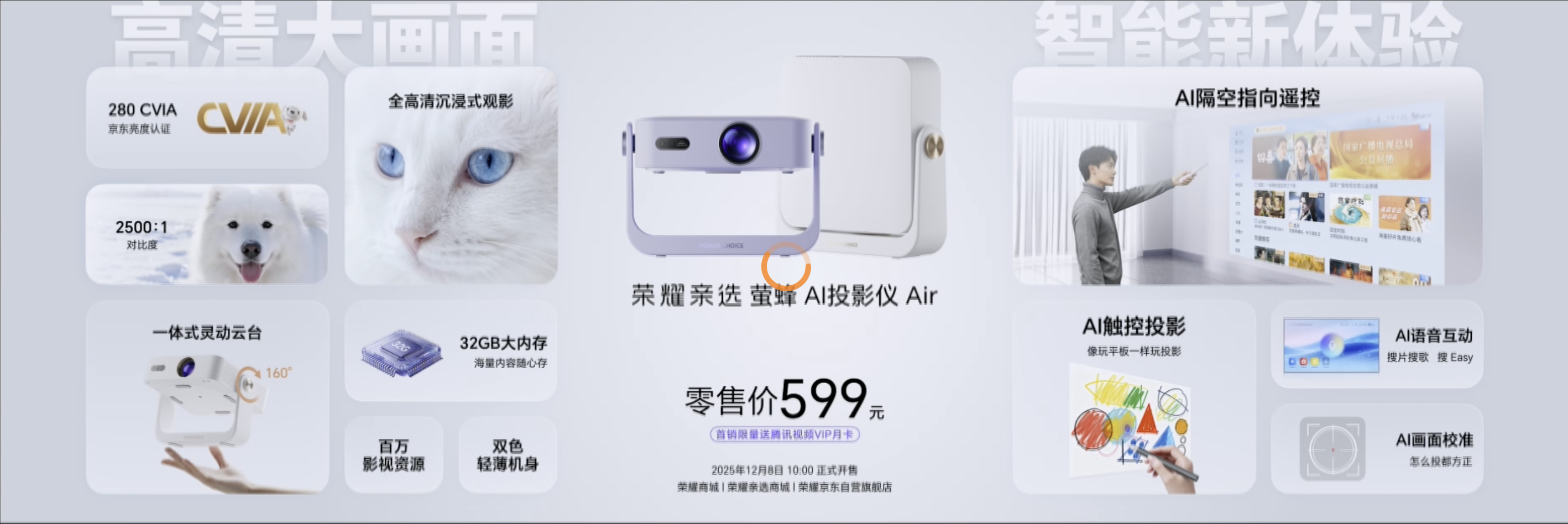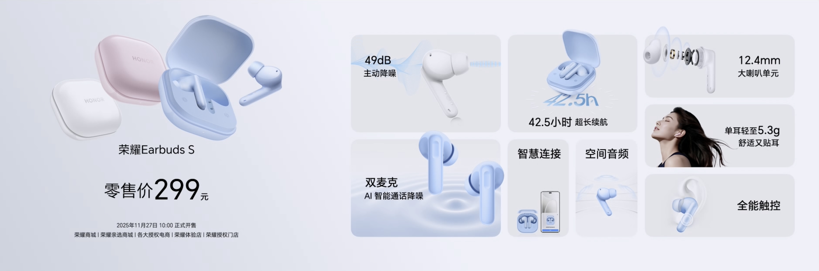 除了系列,这次发布会还发布了几款有趣的新品~- 荣耀手表 X5,1.97英寸极窄边、户外实时气压定位、机身厚度9.9mm、重29g、全面运动配置、支持全天候健康检测、双向蓝牙通话、最长14天续航,售价449元。- 荣耀Earbuds S,49dB降噪、双麦克AI智能通话降噪、最长42.5小时续航、12.4mm喇叭单元,售价299元。- 荣耀亲选 LCHSE 耳夹式耳机 2 Pro,舒适钛拱桥2.0、12mm双磁路单元、LCP液晶振膜、续航最长达44小时,售价549元。- 荣耀亲选 萤蜂 AI投影仪 Air,280 CVIA亮度、一体式云台、32GB内存、AI隔空指向遥控、触控投影、语音互动,售价599元。大伙有没有喜欢的?
