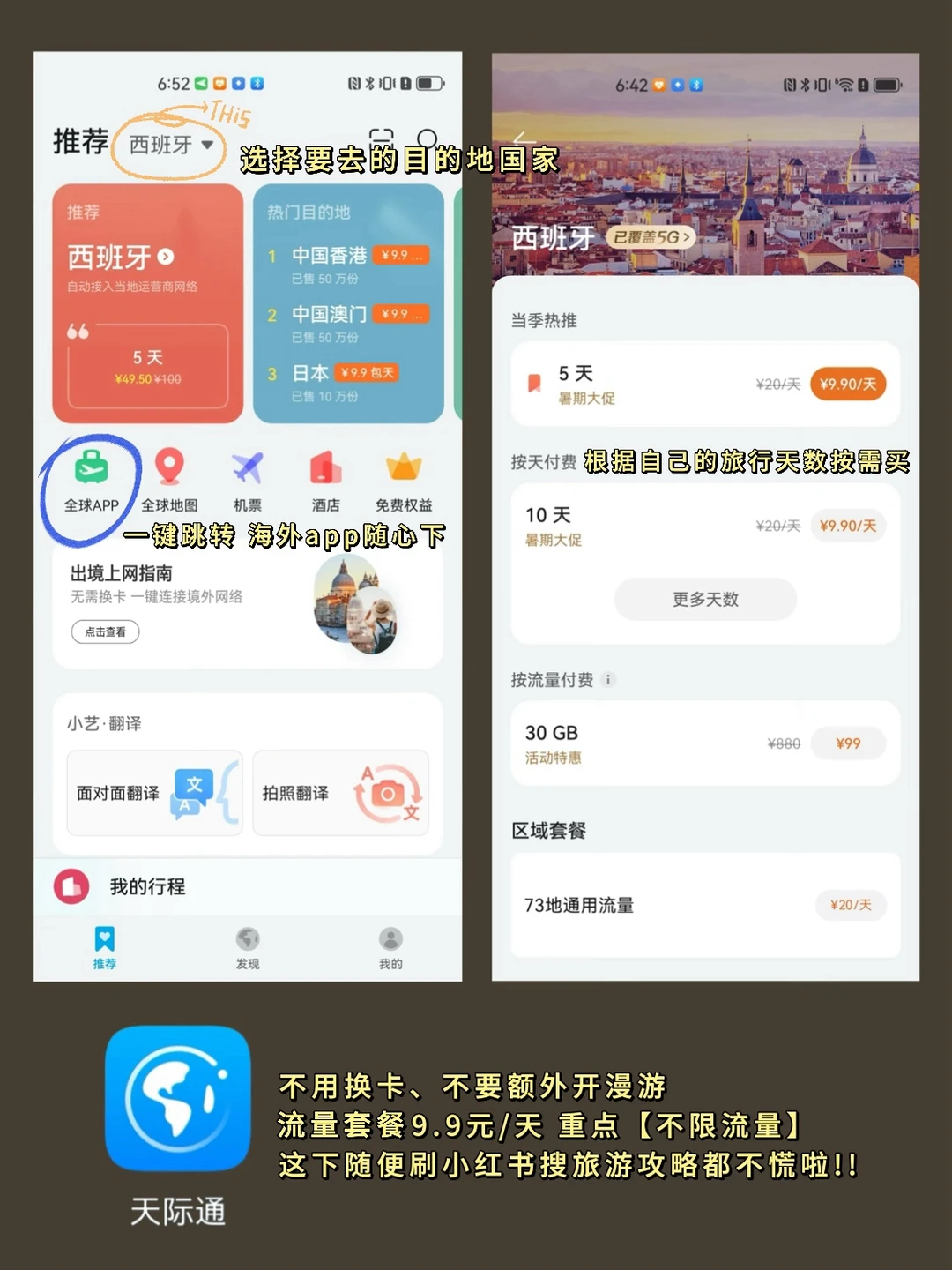 📶上网:海外旅行我对流量要求就是一定要能用境外艾皮皮!我的华为手机自带【天际通】就很便捷实惠 直接买目的地流量套餐只要9.9元/天 流量还不限量 不用换卡落地自动启用 我亲测它家5G网络很快很流畅~刷本地艾皮皮也是非常ok的