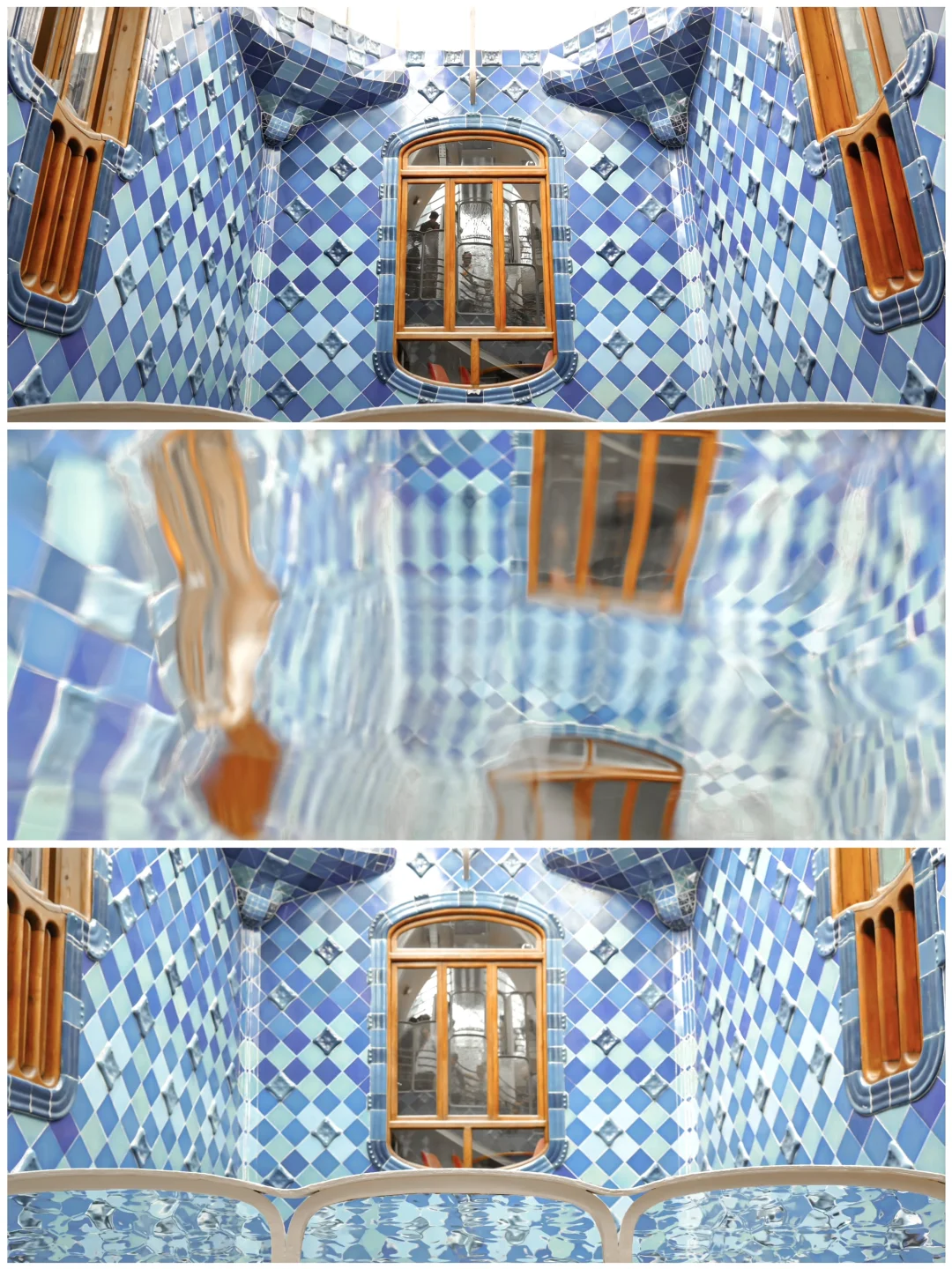 造型怪异的外观像异域星球 透过水纹玻璃看蓝色天井 仿佛海的世界在流动 自然和艺术巧妙融合 不愧是鬼才高迪