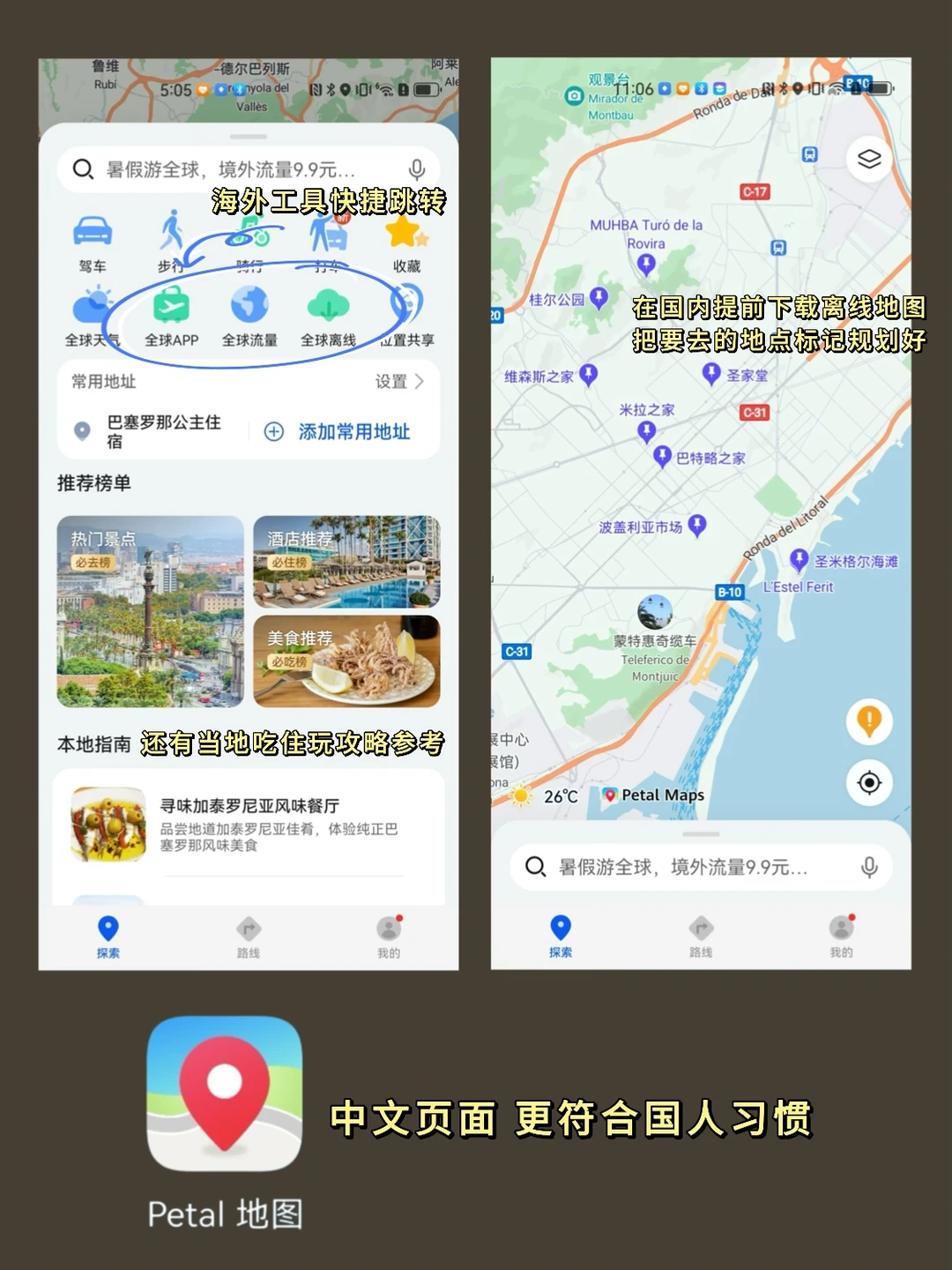 🗺️导航:海外普遍大家都是用谷歌地图 但是【Petal Maps】区别于谷歌在国内不能提前使用的问题 它能很好的帮助我 在国内就可以下载离线地图提前规划好路线 让我旅行事半功倍 而且中文页面也更符合我们habit