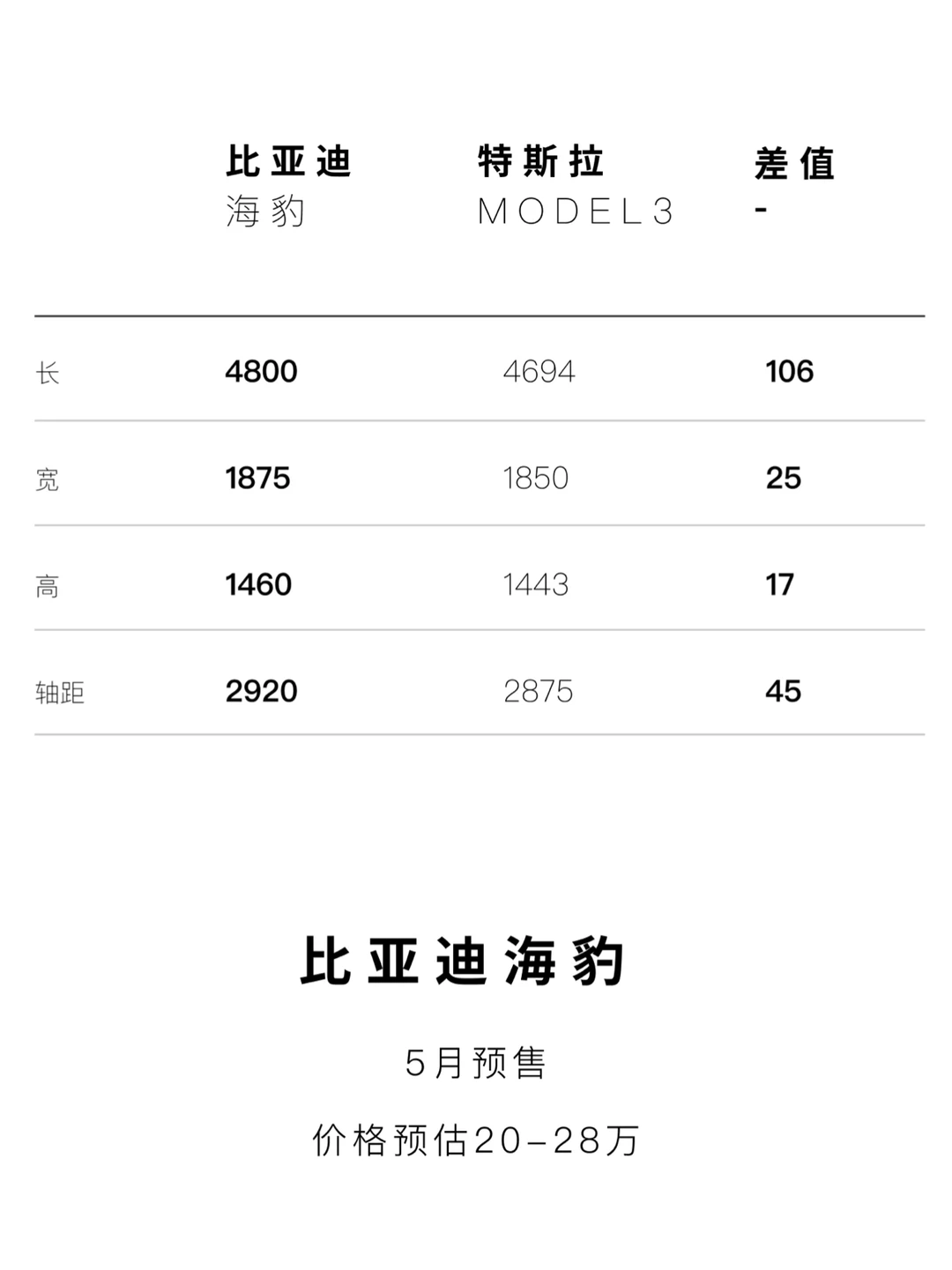 - 🚗在车身尺寸📏上,比亚迪海豹🦭的长宽高分别为4800*1875*1460mm,轴距为2920mm,全面超越Model 3 🚘外观上比亚迪海豹更像是一款跑车,低趴凸显一个“运动感” 💺内饰延续了🌊“海洋美学”的设计理念,相较王朝系列,更多的简约、流线性和未来感🕶 💰价格上预估20-28万,将有150kW单电机、230kW单电机、160kW/230kW双电机四驱三种组合可供选择 ✨预计5️⃣五月开启预售