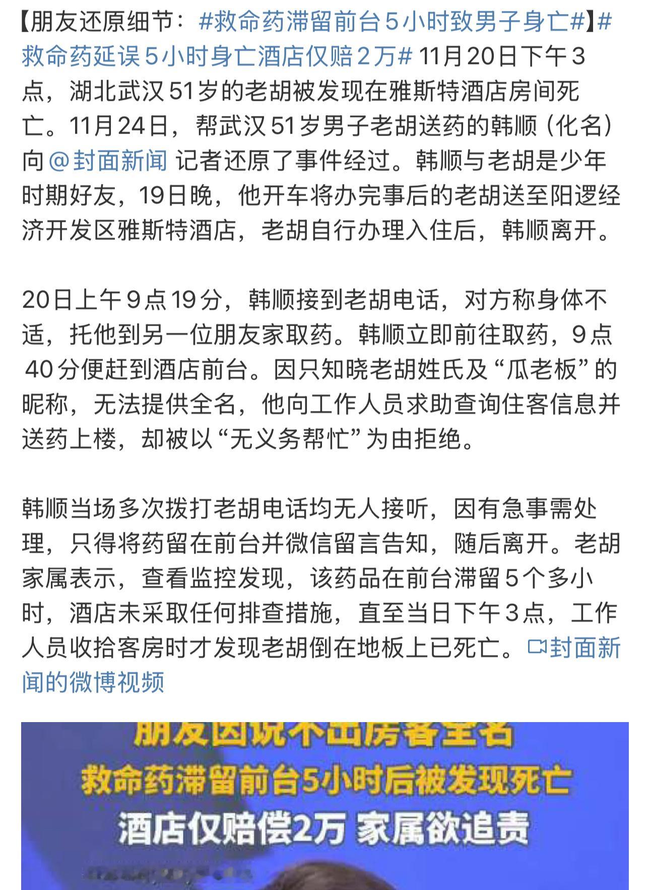 这件事还真是遇到了一系列巧合老胡在酒店突然犯病——少年时期的好友和给他药的好友偏偏不知道他真实身份——酒店发现送药没引起足够的重视,最终导致悲剧的发生。个人建议还是走法律途径吧,这件事闹舆论没用……