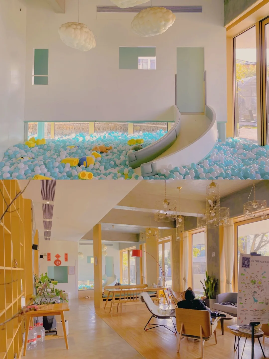 民宿外观类似一座童话城堡镇,亲子民宿特色有很多适合不同年龄段小朋友玩的游玩设备,除了民宿庭院的秋千➕蹦床沙坑,草坪上各种小动物模型,一楼大堂有个超大海洋球滑梯,马克龙配色也很清新。