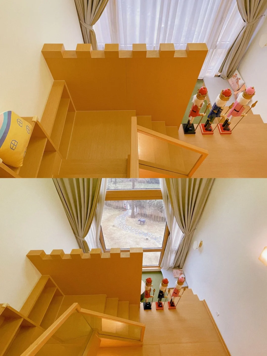 整个房间设计是loft结构的,有楼上楼下两张床🛏,原木清新风的配色很温馨。