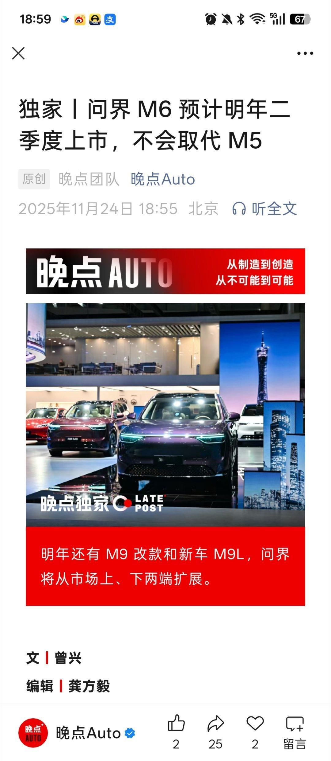 加完班刚看到。晚点独家:问界 M6明年 Q2上市已知M5价格区间22.98-24.98wM7价格区间27.98-37.98w所以 M6加进来,是要把20-30w 价位围的水泄不通啊。这个价位的竞争者是谁,理想 i6、小米 YU7、Tesla Model Y。问界可以杀出重围么?!