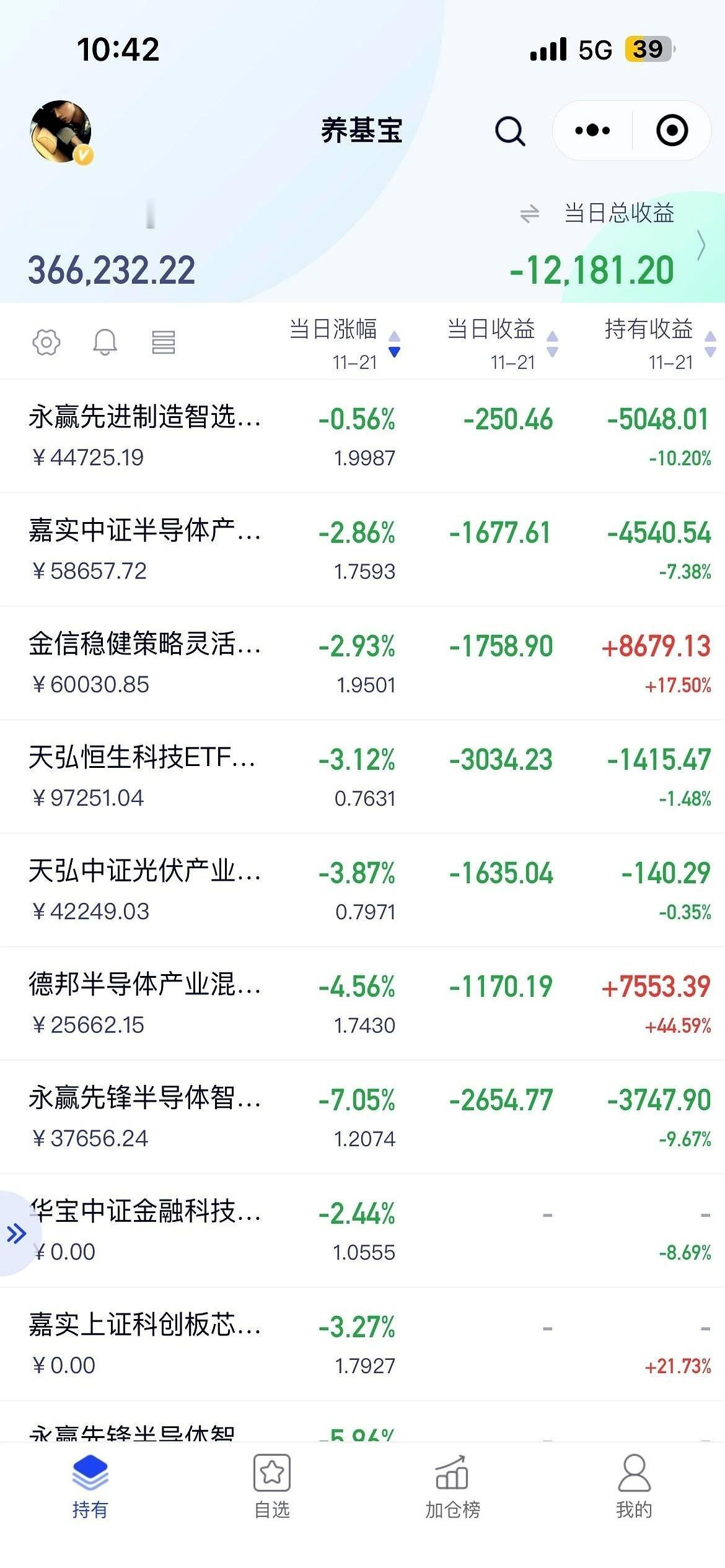 今天我账户里有个东西,-9%。 放眼一看,好家伙,将近5000家在跌,一片绿油油,跟大草原似的。 连着亏6天了,真的会怀疑人生。这种阴跌,钝刀子割肉,比一刀砍下来还折磨人。 真的麻了。 人家外围涨,我们思考一下,保持独立行情;人家外围跌,我们一步到位,跟得死死的,生怕掉了队。 你说气不气人。 今天谁最惨?就是前段时间最风光的那些。固态电池、CPO、存储芯片…之前让你多爽,今天就让你多疼。 老话怎么说来着?盈亏同源。 你靠什么吃上了肉,就得做好准备被它反咬一口。涨得最凶的,往往摔得最狠。 最难受的,还是那批刚冲进来追高的兄弟。兴冲冲地上了车,结果发现是山顶,风呼呼地吹,脑瓜子嗡嗡的。 所以说,“追涨毁一生”,这话听着俗,但每个字都是用钱买来的教训。 不瞒你们说,我今年的收益,今天也光荣归零了。 还好昨天手快,转了4万出去,不然今天亏得裤衩都没了。也算是给自己留了点最后的体面吧。 市场终于放量了,说明很多人扛不住了,把带血的筹码交了出来。 下午估计会收回来点,但今天这碗大面,是吃定了。 唉,出来混,迟早要还的。