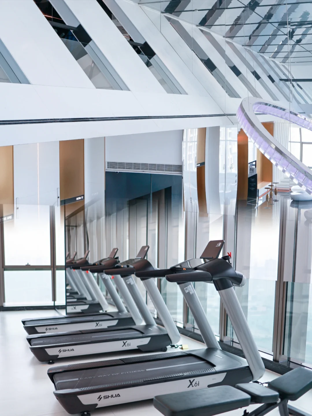🏃可望江景房健身器材。健身房位于酒店31楼,与位于30层的酒店大堂连通。一侧跑步机临窗摆放,健身的时候也能欣赏到窗外的景色。