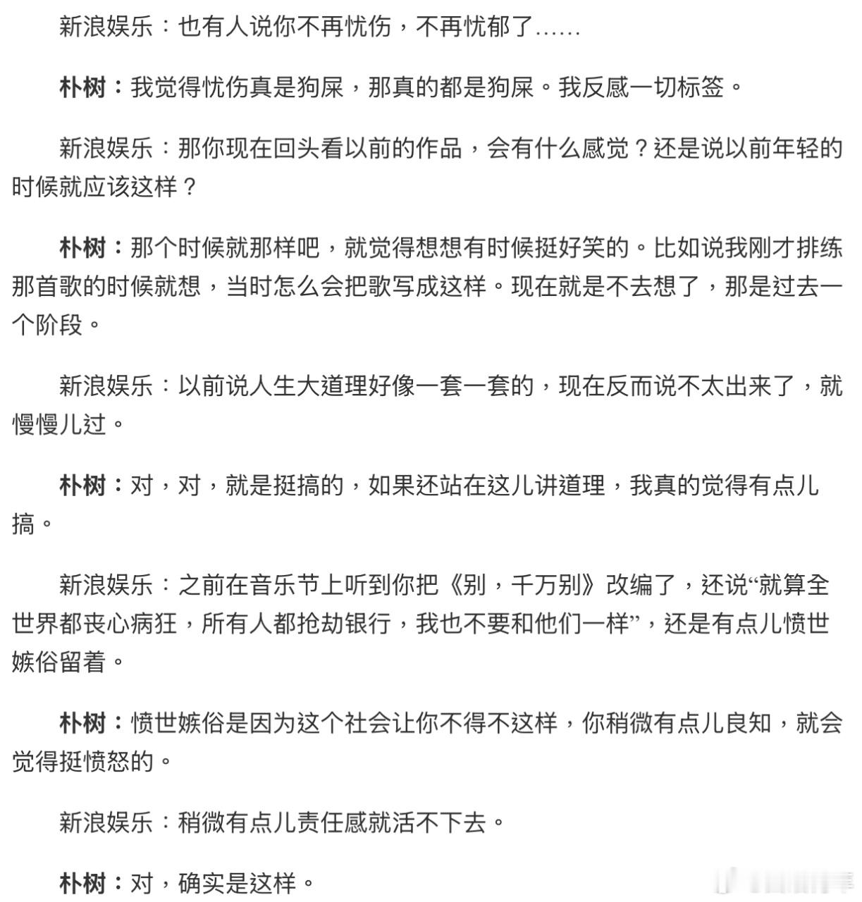 朴树:我觉得忧伤真是狗屎,那真的都是狗屎。我反感一切标签。