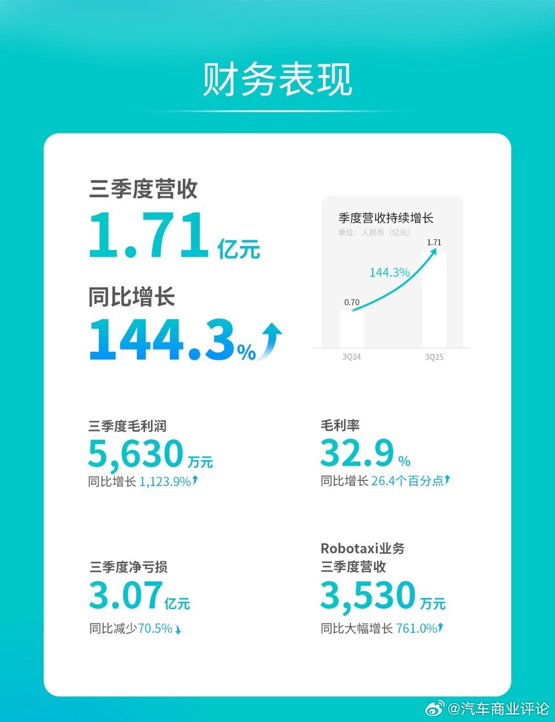 11月24日,文远知行WeRide发布2025年第三季度财报。三季度,公司营收1.71亿元,同比增长144.3%,是公司成立以来涨幅最大的季度之一;Robotaxi业务营收3,530万元,同比增长761.0%,延续强劲增长势头;毛利润5,630万元,同比增长1,123.9%;毛利率32.9%,同比增长26.4个百分点,持续领跑行业;净亏损3.07亿元,同比减少70.5%。经调整后亏损(Non-IFRS net loss)2.76亿元。截至2025年10月30日,公司自动驾驶车队规模超1,600辆,其中Robotaxi数量近750台,展现全球规模化运营优势。