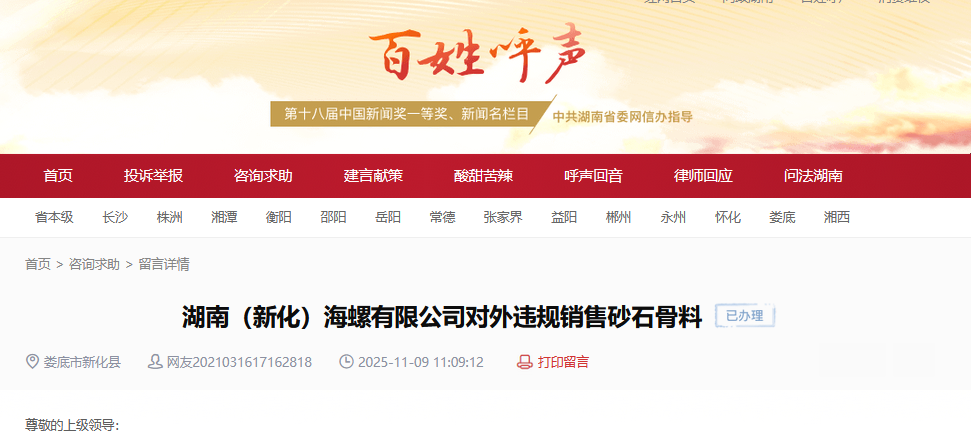 近日,据湖南红网《百姓呼声》频道显示,湖南省娄底市新化县民营砂石企业举报湖南(新化)海螺有限公司对外违规销售砂石骨料,具体如下: