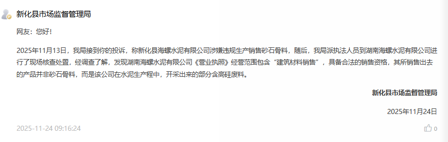 对于上述问题,新化县市场监督管理局于11月24日回复称,经调查了解,发现湖南海螺水泥有限公司《营业执照》经营范围包含“建筑材料销售”,具备合法的销售资格,其所销售出去的产品并非砂石骨料,而是该公司在水泥生产程中,开采出来的部分含高硅废料。