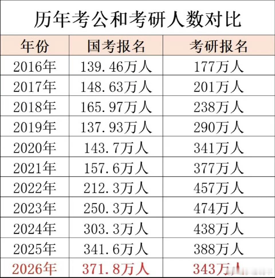 看这考公考研人数对比,也太卷了!考公人数一年比一年涨,2026年都要超过考研了,