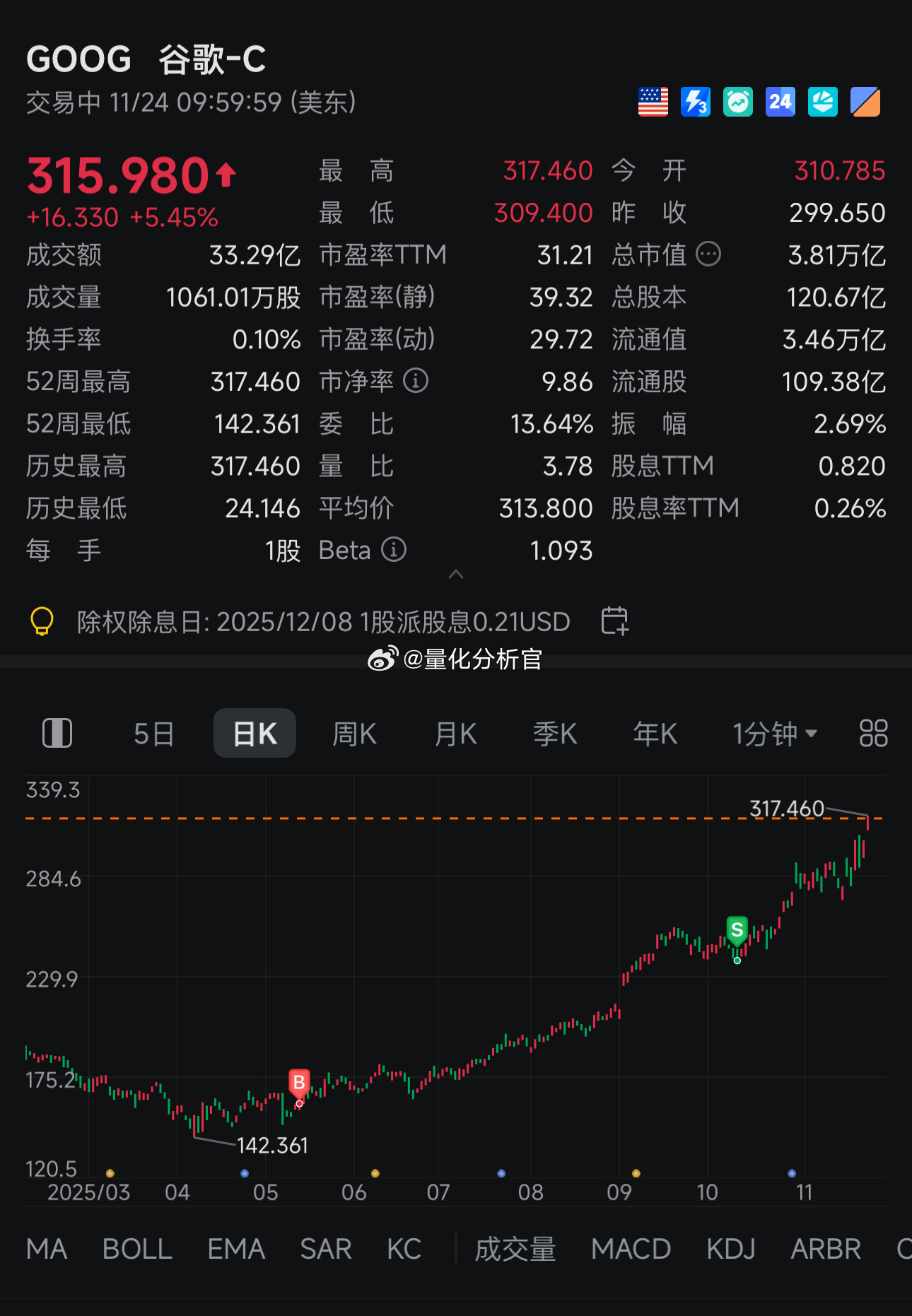 谷歌在gemeni3.0的惊艳表现之后再创历史新高,核心粉应该都知道,谷歌是今年美股抄底射出的最后一支箭,美中不足的是已经提前止盈了30%