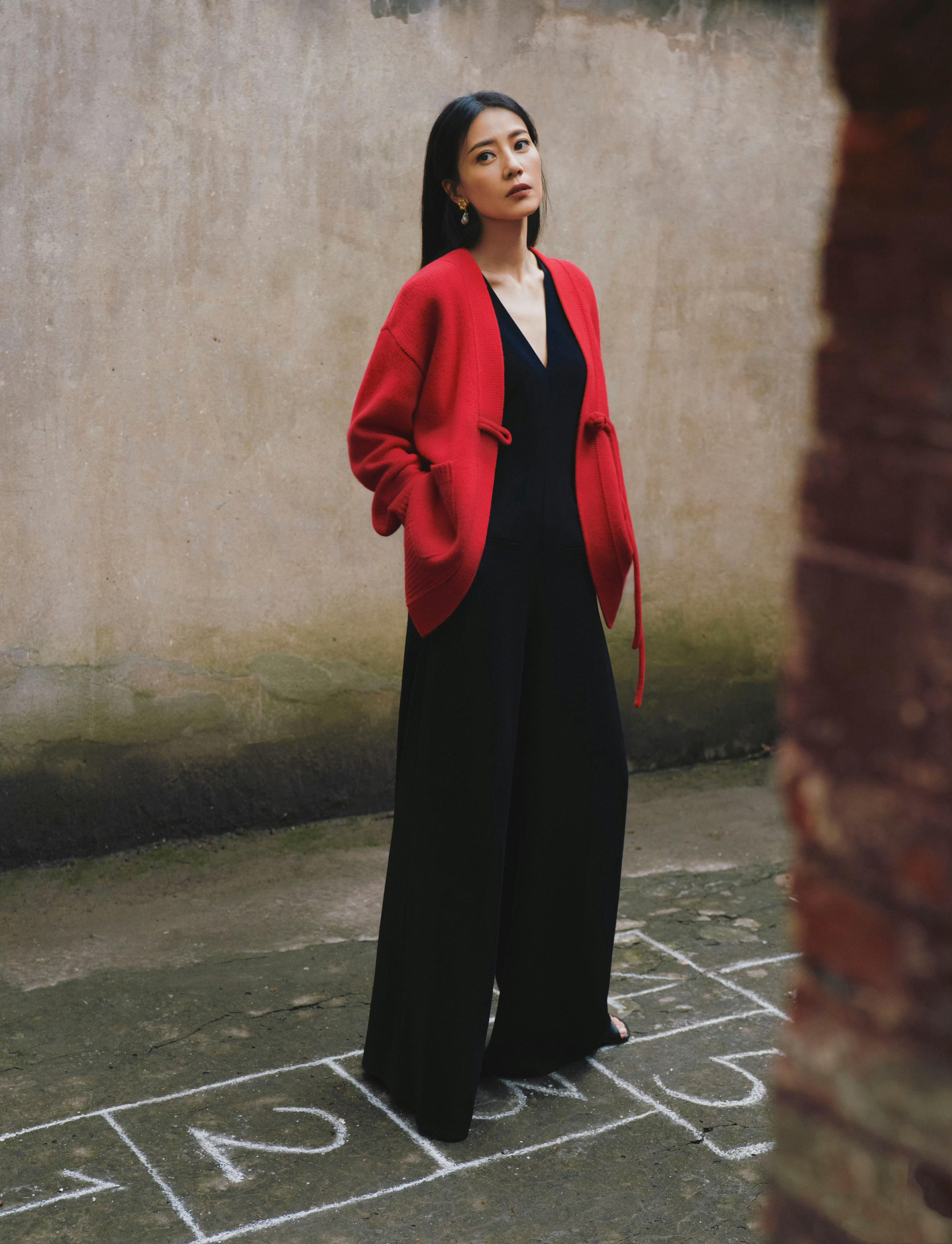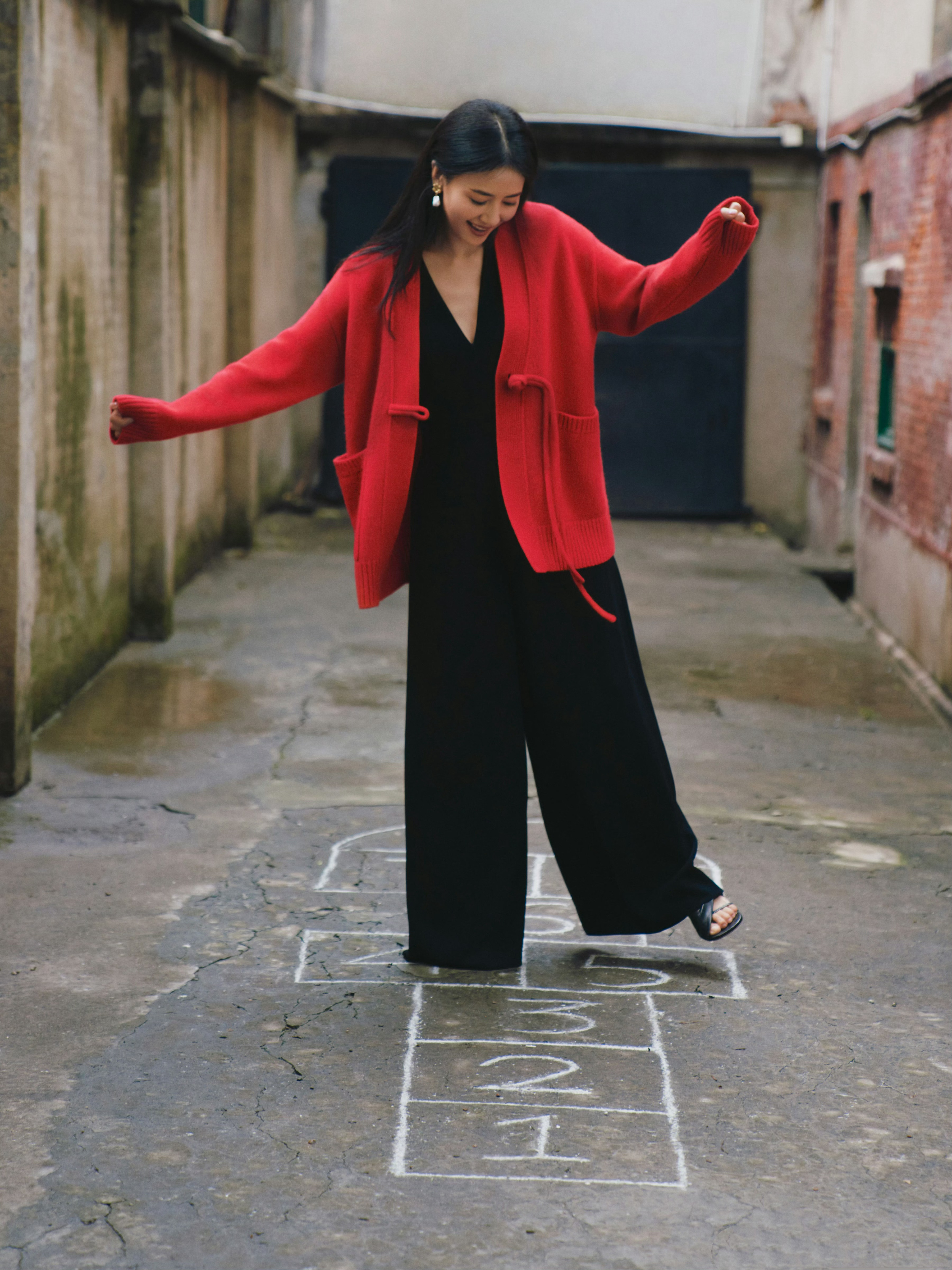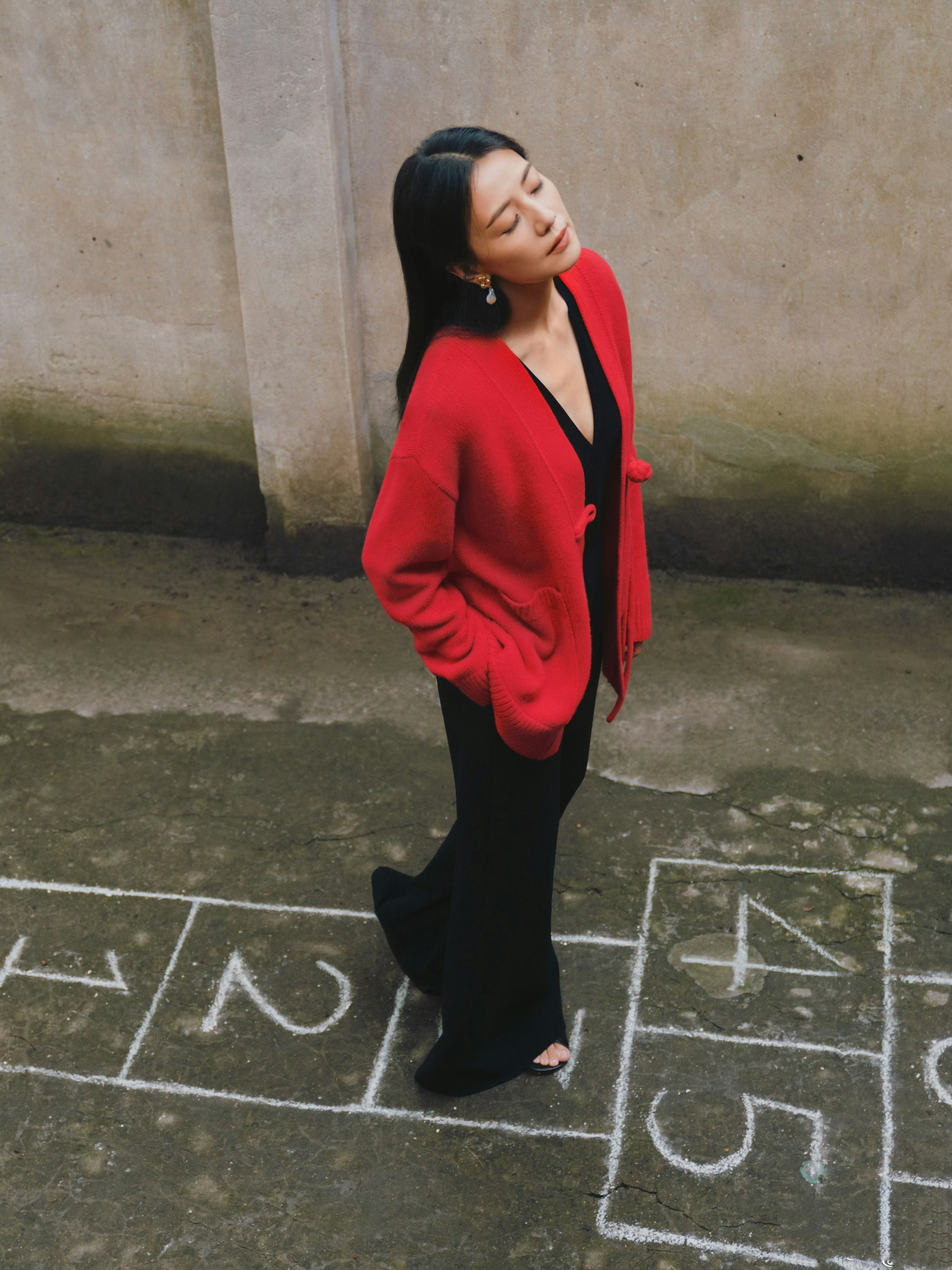 红色盘扣开衫与黑色深V阔腿裤搭配,复古与时尚交融,红黑撞色吸睛,尽显优雅随性。