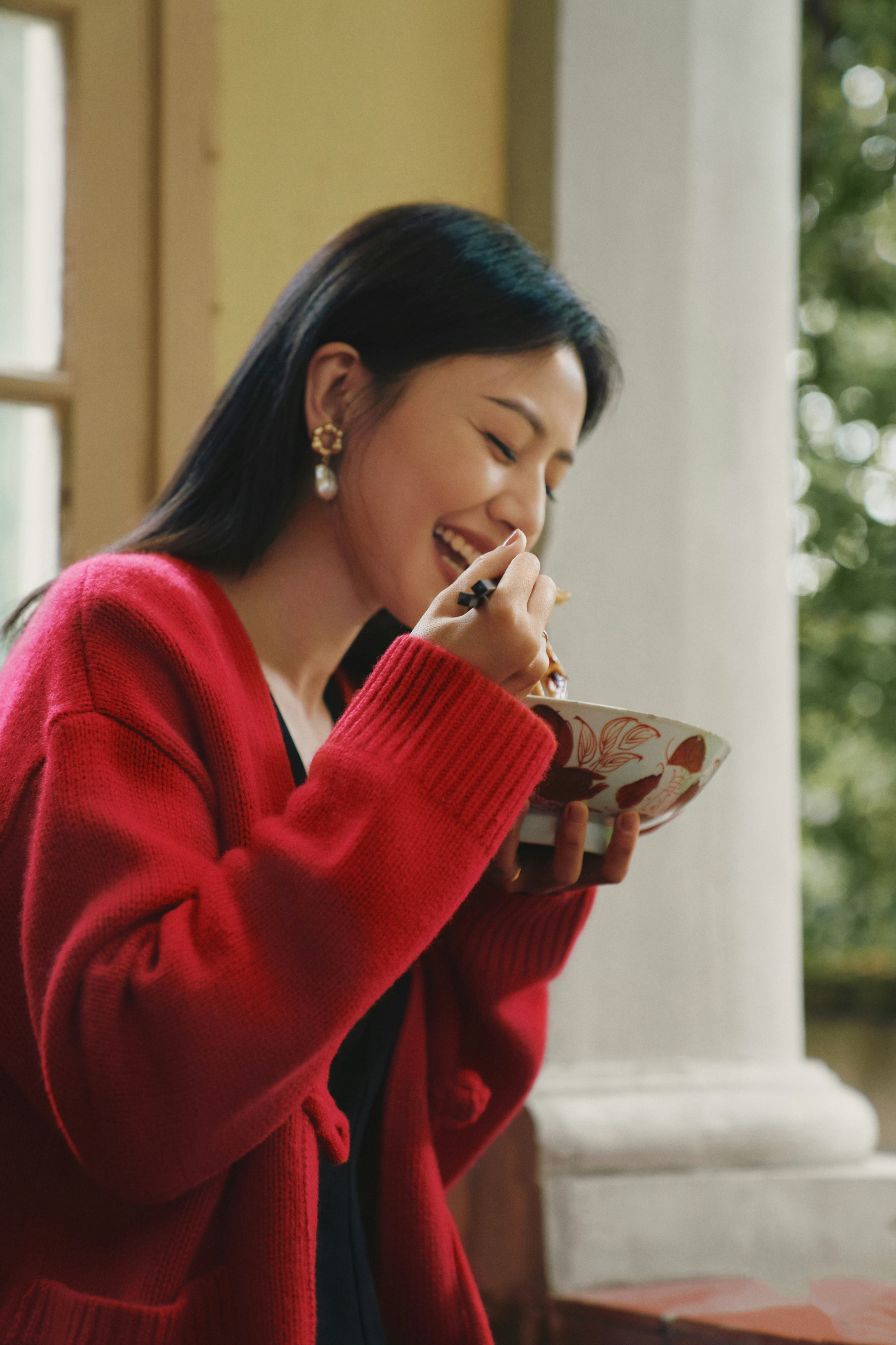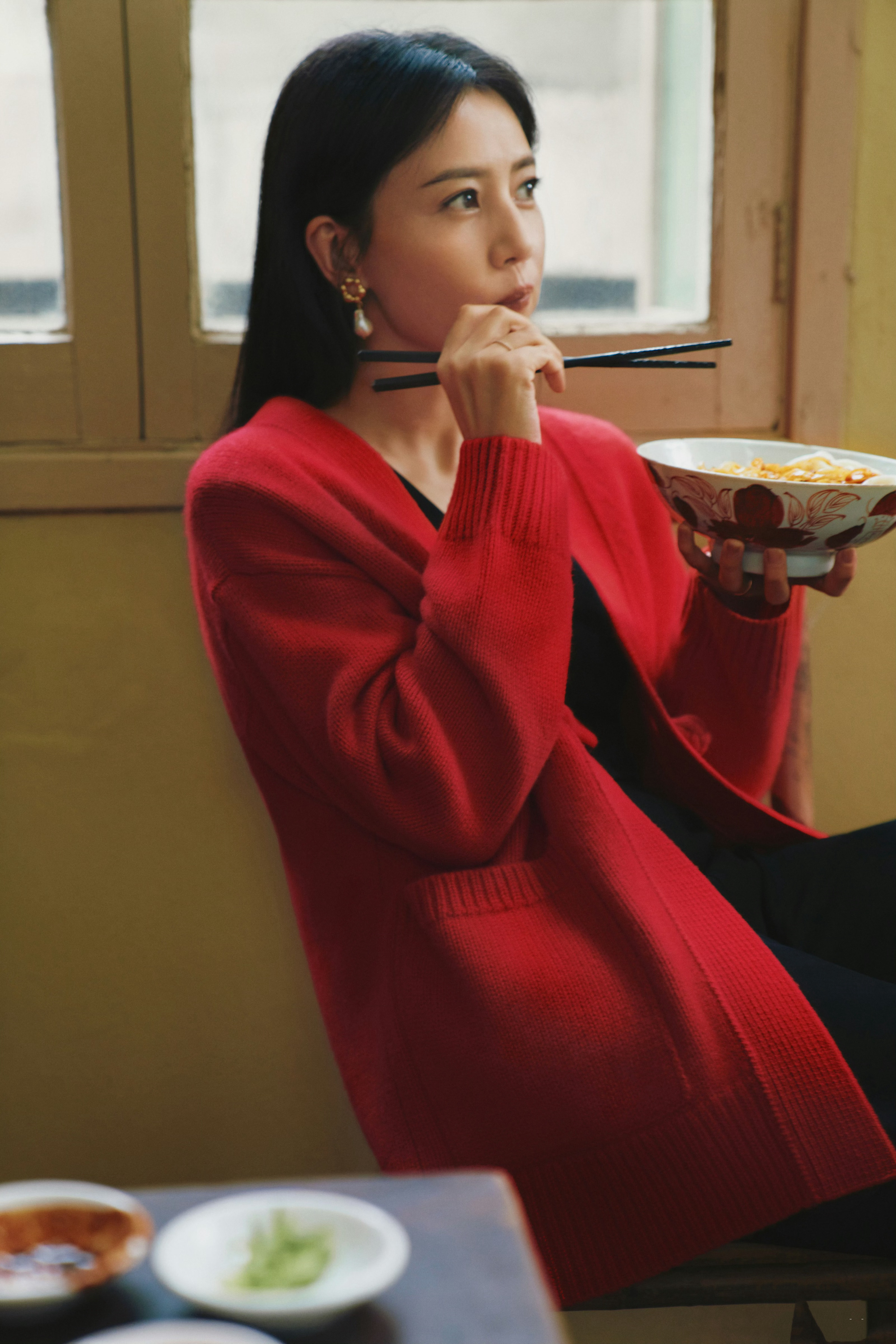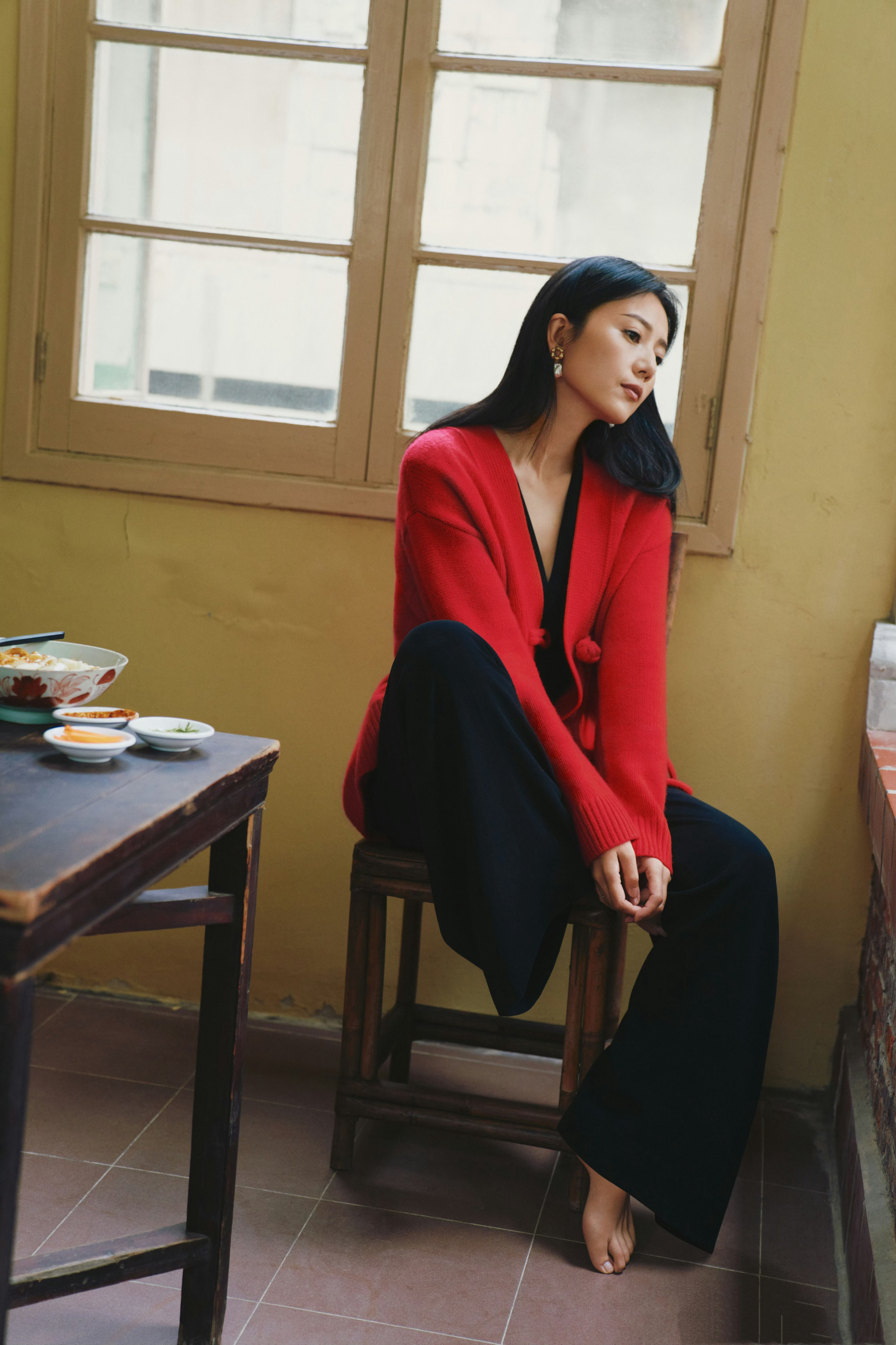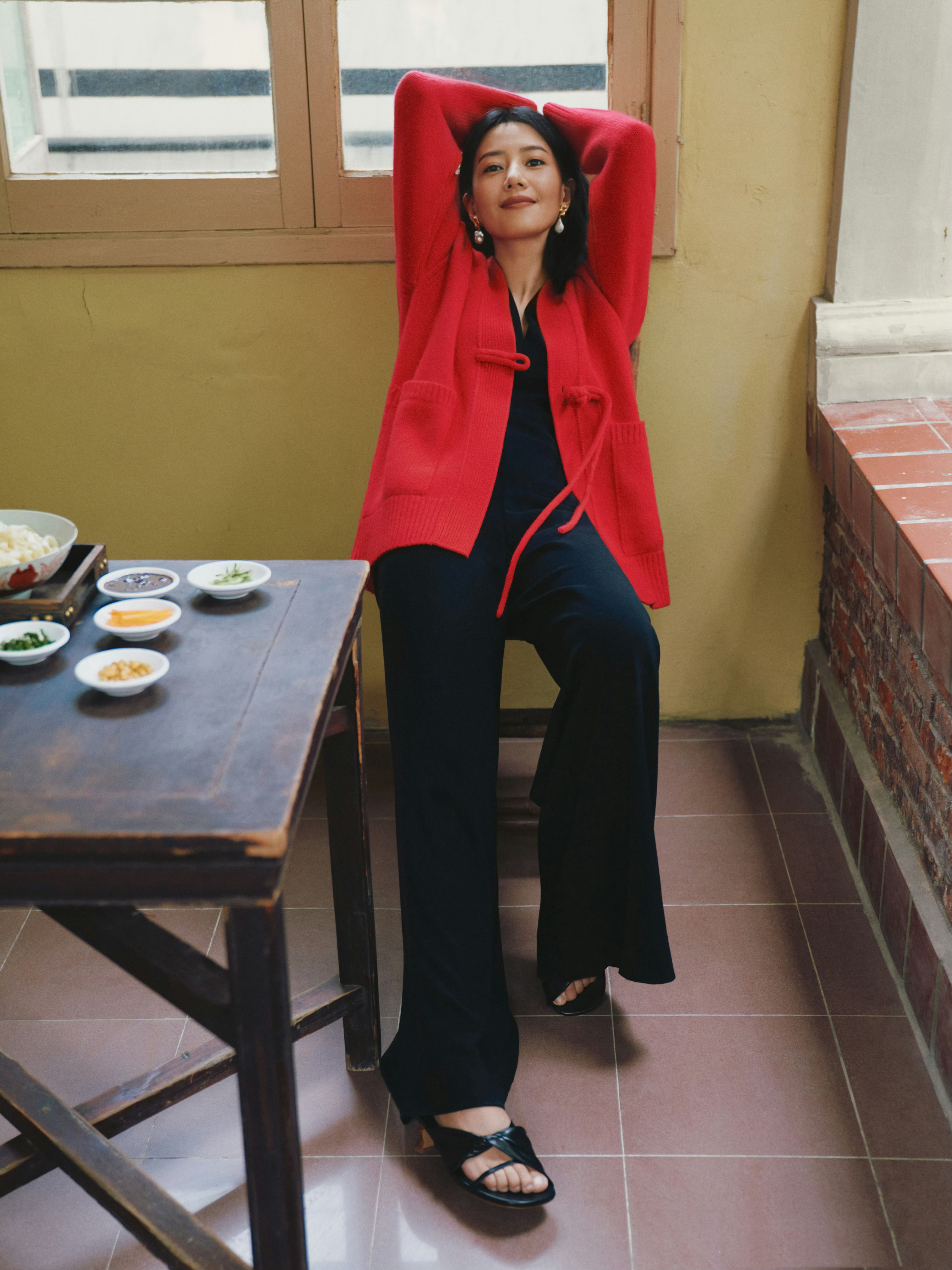 红色盘扣开衫与黑色深V阔腿裤搭配,复古与时尚交融,红黑撞色吸睛,尽显优雅随性。