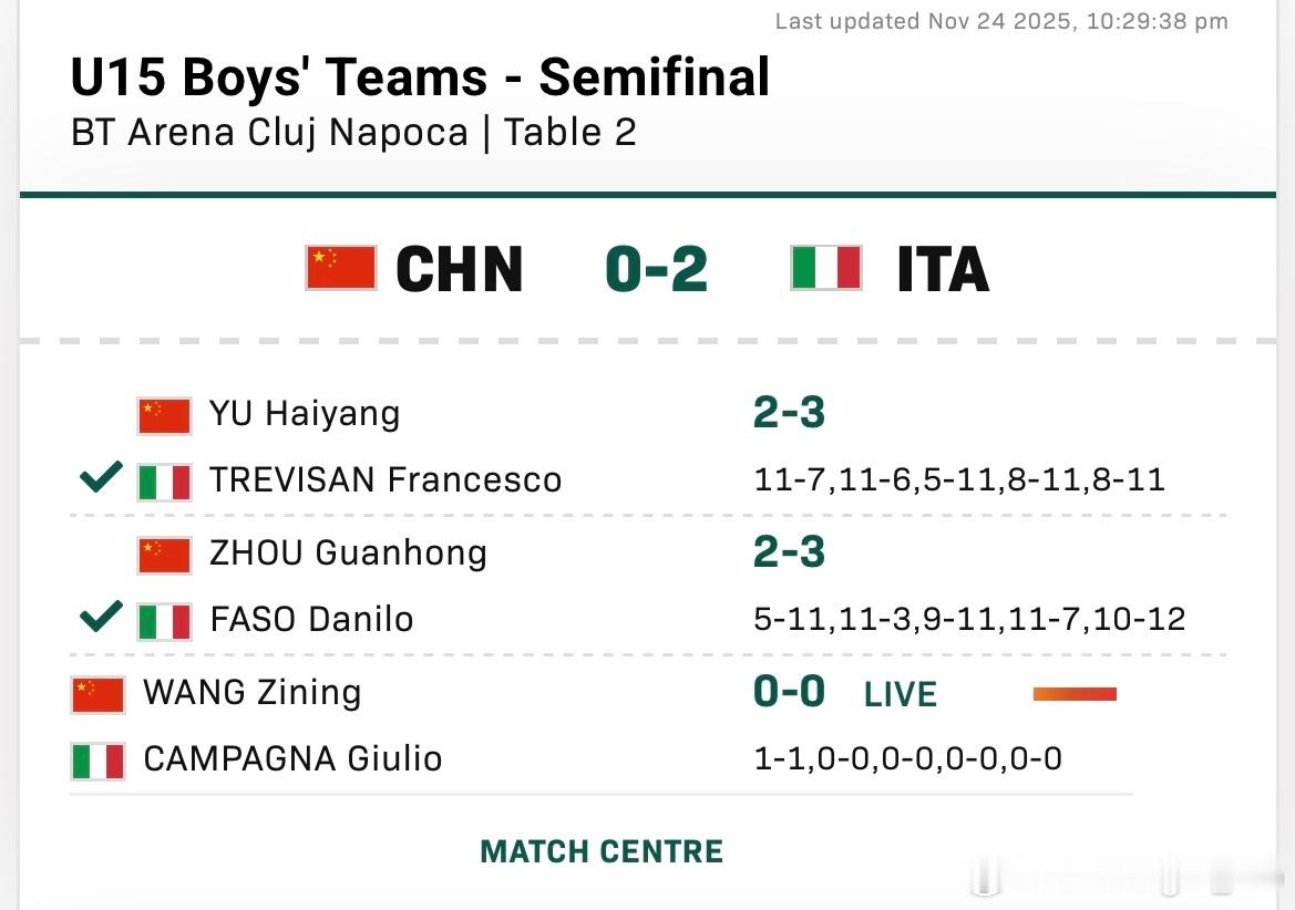 U15男团半决赛🇨🇳中国0-2意大利🇮🇹周冠宏2比3达尼洛·德米特里·法索(5-11、11-3、9-11、11-7、10-12)