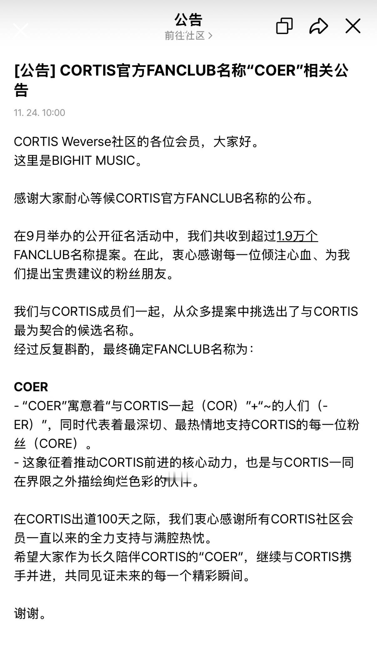 Cortis 宣布粉丝名Coer 完成了BigHit 从阿米 馍啊 到烤鹅的老吃