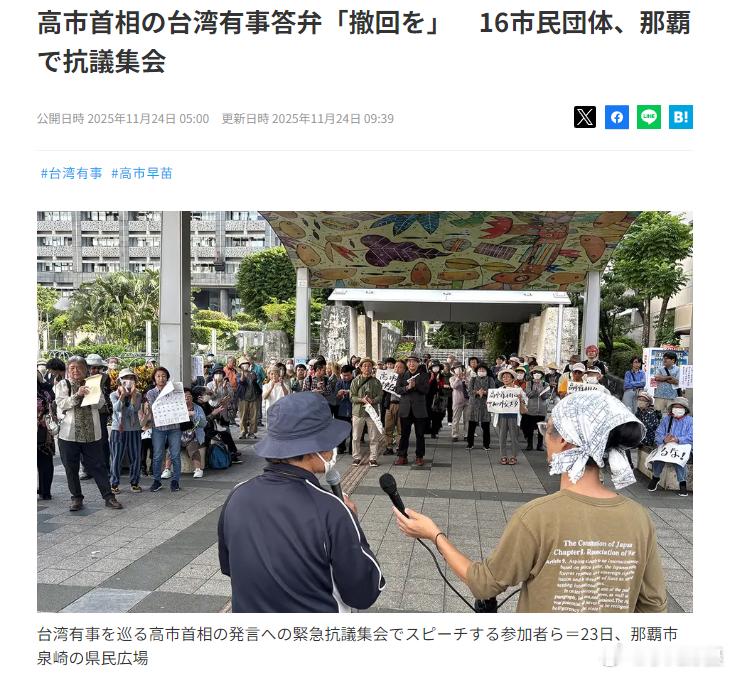 据琉球媒体:琉球那霸市民众要求高市早苗撤回发言并辞职。一名那霸市的20多岁的男性公司职员介绍说,他的祖父曾经是渔民曾经到钓鱼岛周边捕鱼,与中国渔民友好相处。他说:“我认为最受损失的是普通民众。不能容忍一个为了自己的人牺牲弱势群体。”