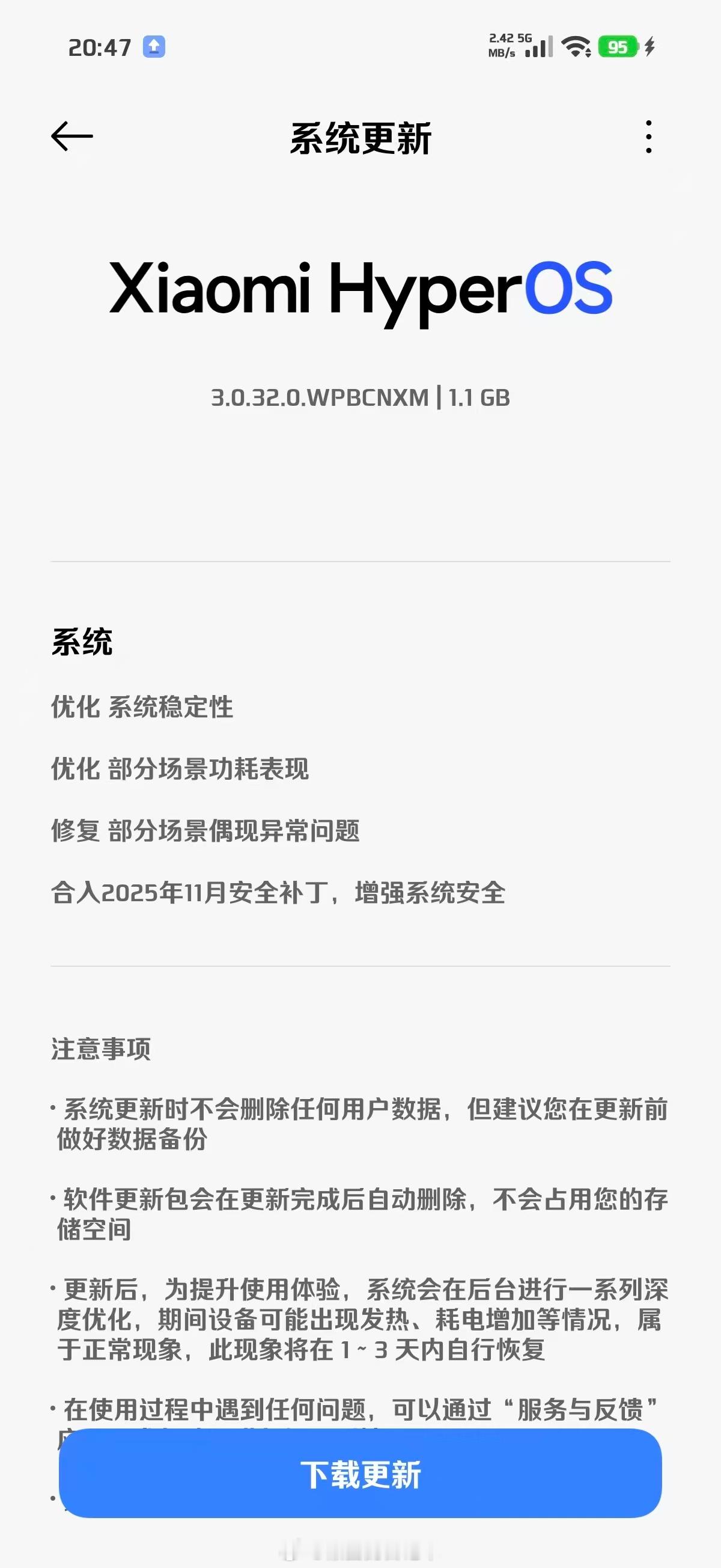 Xiaomi 17 Pro Max已推送 OS3.0.32.0.WPBCNXM正式版内测,有设备的小伙伴可以去更新了。详细更新内容:系统优化 系统稳定性优化 部分场景功耗表现修复 部分场景偶现异常问题合人2025年11月安全补丁,增强系统安全