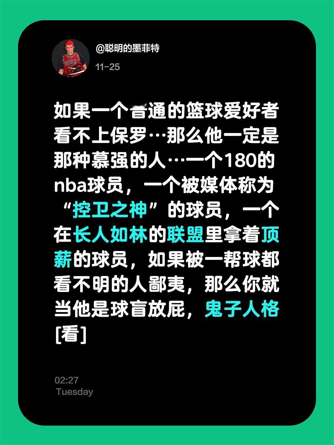 如果一个普通的篮球爱好者看不上保罗…那么他一定是那种慕强的人…一个180的nba球员,一个被媒体称为“控卫之神”的球员,一个在长人如林的联盟里拿着顶薪的球员,如果被一帮球都看不明的人鄙夷,那么你就当他是球盲放屁,鬼子人格[看]篮球球星 nba球星 篮球之神 最喜欢的nba球星 nba