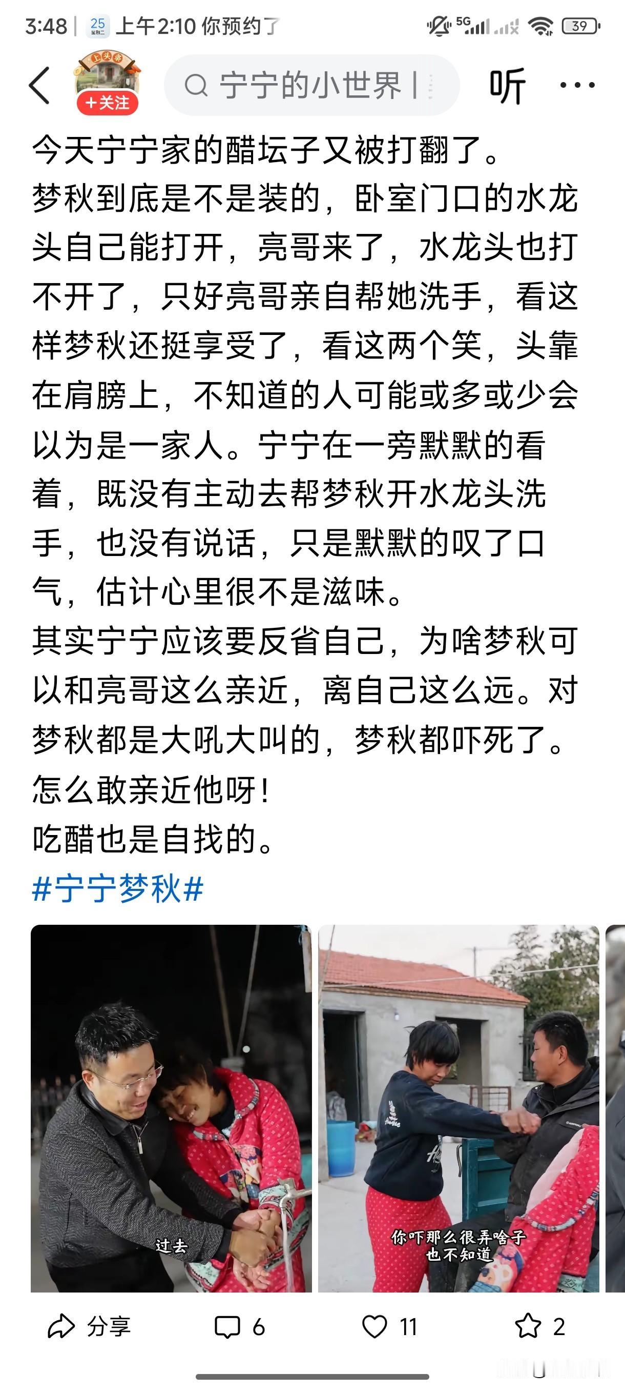 要不我说智力有问题的女人,歪脑筋比正常女人多得多。梦秋平时自己会开水龙头,为啥亮哥来了就打不开了呢?说明她会装,会在男人跟前示弱,这不让亮哥帮她洗手,她又跟他玩起腻歪。 能怪宁宁对她不是喊就是骂吗?一个人长期日积月累面对一个疯子的折磨,给他亮哥他也一样,他天天来就是那拍视频的一会,再说梦秋的屎尿他亮哥帮着铲了几回?梦秋的屎屁股他擦过吗?真的不要拿亮哥和宁宁比,亮哥在装,宁宁可是实打实的在伺候这疯婆娘。 朋友们,你们说呢?
