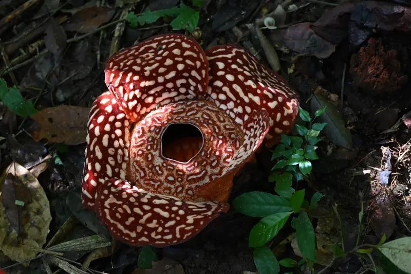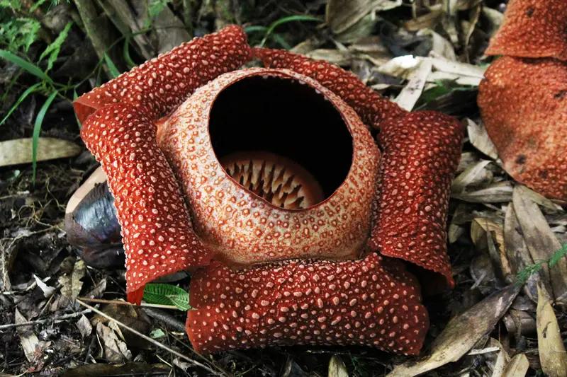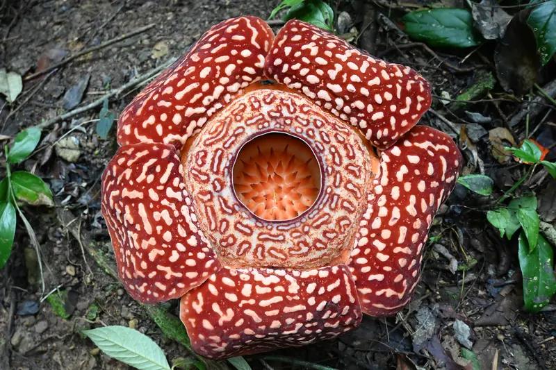 科学家花13年才发现罕见哈氏大王花,这寻找过程太不容易了。2025年11月17日,在印尼西苏门答腊省的森林深处,科学家们终于见证它盛开。印尼向导安德里基找了13年,看到花时激动落泪。 哈氏大王花直径约60厘米,花瓣厚实,深红色带白色斑纹,花心像榴莲皮,模样诡异。它无叶、无茎、无根,是完全寄生植物,靠“吸器”从宿主根部获取养分。花期只有4 - 7天,还散发腐肉味吸引苍蝇传粉。这种花太稀有,难怪说老虎见它的次数比人多。