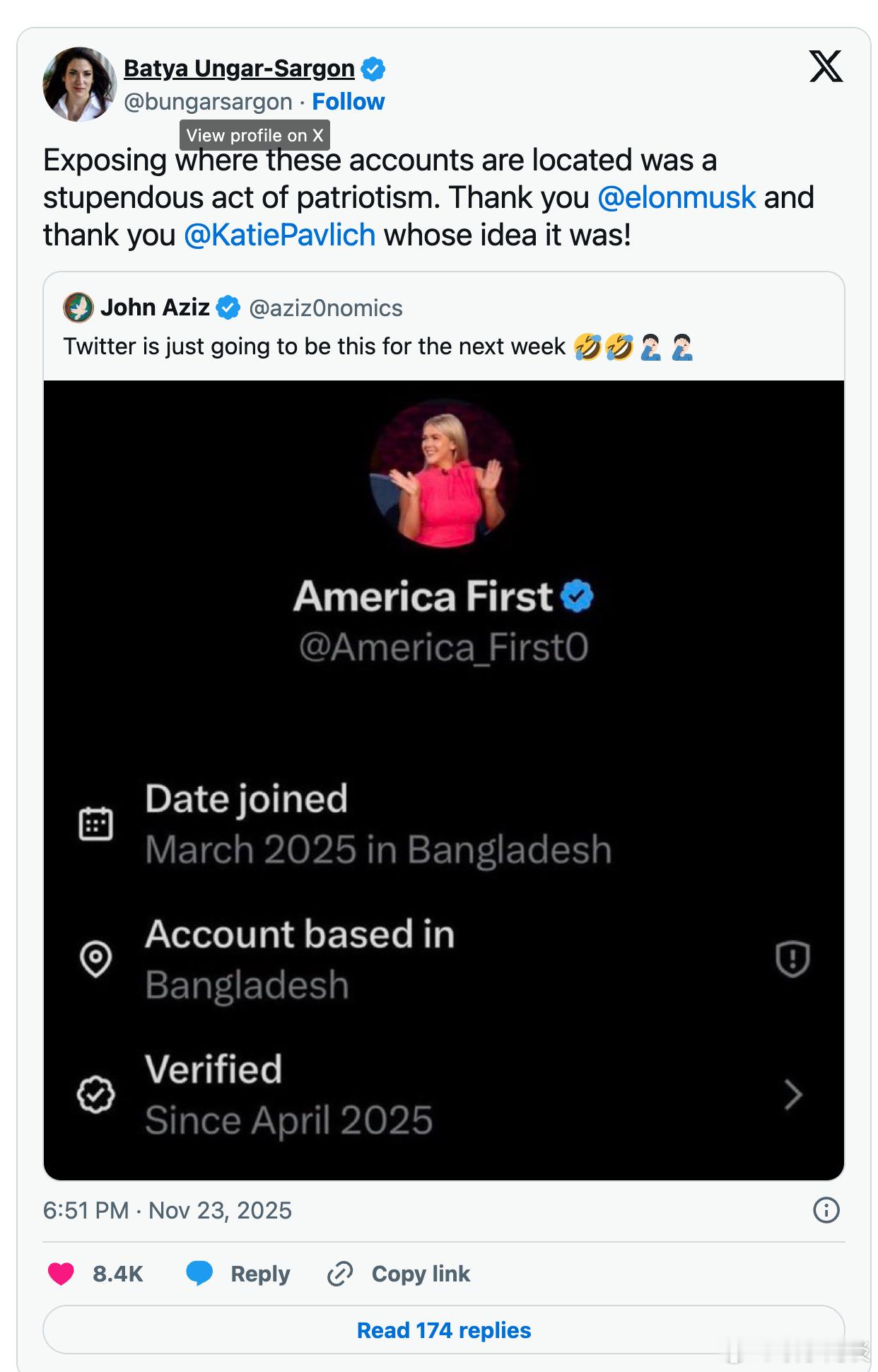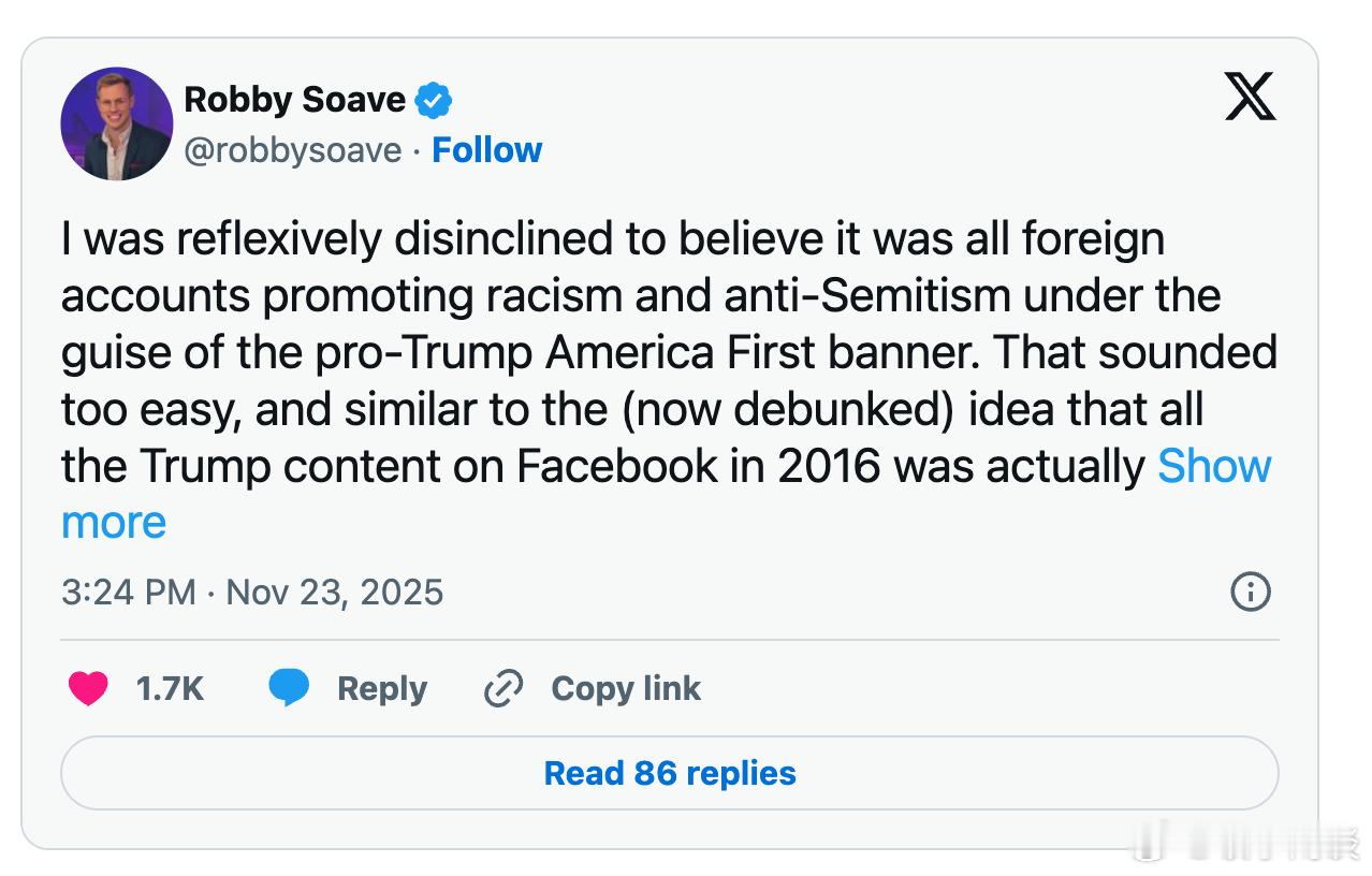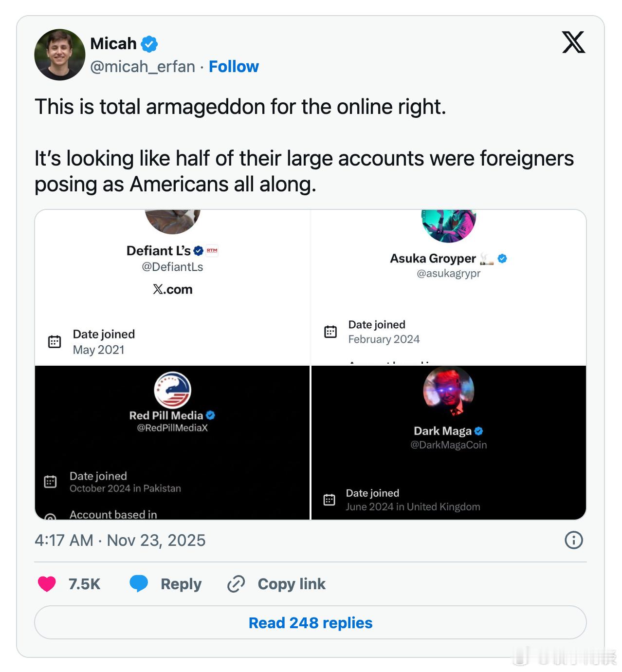 【马斯克因新功能揭露许多政治X账户来自国外而受到赞扬:“惊人的爱国行为”】埃隆·马斯克周末获得了广泛赞誉,此前他的 X 团队的开发人员推出了一项新功能,显示账户的全球位置,揭示了美国政界许多有影响力的人物实际上都居住在海外。尽管网络安全专家和普通社交媒体用户长期以来一直警告称,一些机器人和外国势力恶意利用网络煽动性言论,在美国政坛煽动愤怒、怨恨甚至仇恨,但马斯克最终提供了确凿的证据,证实了这一点。许多被曝光的海外账户都带有支持特朗普的“让美国再次伟大”(MAGA)标签,或是尼克·富恩特斯(Nick Fuentes)的“Groypers”账号。这项新功能的拥趸们也很快指出,大量声称从加沙或美国境内发声的亲巴勒斯坦账户,实际上可能远在澳大利亚或印度尼西亚。支持特朗普的NewsNation主持人巴蒂亚·昂加尔·萨尔贡分享了一个带有“让美国再次伟大”(MAGA)标志的账号,该账号被证实位于孟加拉国。萨尔贡写道:“曝光这些账号的所在地是一项了不起的爱国行为。感谢elonmusk,也感谢KatiePavlich,这是她的主意!”《理性》杂志的罗比·索维补充道:“我本能地不愿相信这一切都是外国账号打着支持特朗普的‘美国优先’旗号,宣扬种族主义和反犹太主义。这听起来太简单了,而且类似于(现已被驳斥的)2016年Facebook上所有特朗普相关内容实际上都是俄罗斯水军发布的说法。”“但是……据我所知,这个‘账户所在地’功能实际上已经把很多 Groyper 账号从巴基斯坦人名单中剔除了?这个功能非常实用,要感谢埃隆·马斯克和他的 X 团队实现了它。仇恨并非来自内部!”他补充道。X 在位置信息旁边添加了一条免责声明,指出:“帐户所在的国家或地区可能会受到近期旅行或临时搬迁的影响。此数据可能不准确,并且会定期更改。”左倾评论员米卡·埃尔凡分享了几个极右翼账号的截图——其中包括与富恩特斯有关联的账号,这些账号被证实位于巴基斯坦和泰国等国家——并评论道:“这对网络右翼来说简直是世界末日。看来他们一半的大账号一直都是伪装成美国人的外国人。”《The Dispatch》的Jonah Goldberg分享了周末期间曝光的几个账户,并补充道:“这种显示原籍国的功能是一项真正的进步,我对此表示赞赏。”