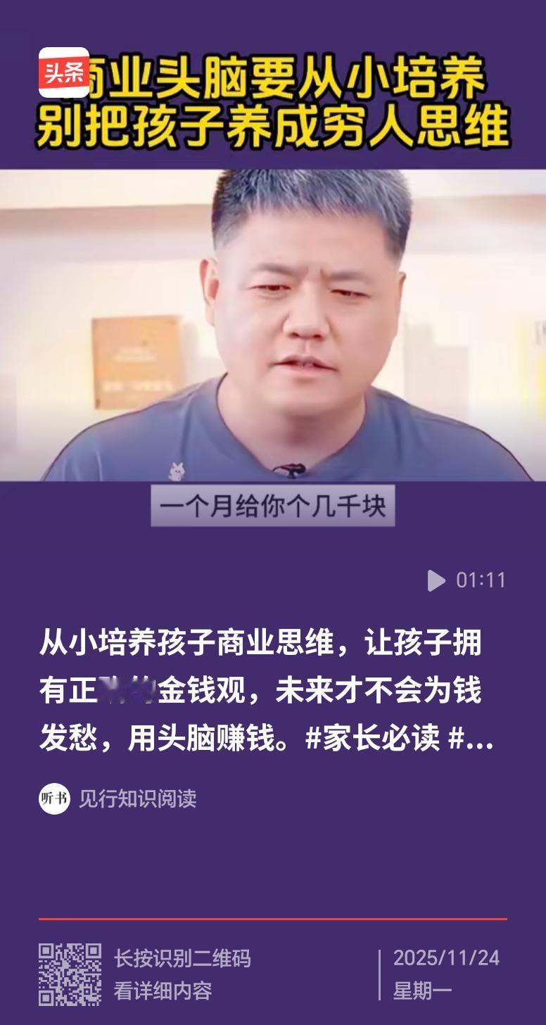 kids的钱观,真得从小抓。 别等长大了才说“你不懂钱”。 现在7成家庭都在教孩子怎么花钱、怎么存钱。 不是为了让孩子提前当“小老板”,而是让他们知道每一分钱的来之不易。 劳动换钱,不是为了宠坏他们,而是让他们学会责任。 一分一分攒,不是为了抠门,是为了懂得规划。 超市买东西前先算账,不是为了省钱,是为了不乱花。 孩子不是不会理财,是没人教他们怎么开始。 别把财商教育当成“赚钱课”,那是本末倒置。 真正的财商,是让孩子明白:钱可以买什么,也可以放弃什么。 别让孩子变成“小富翁”,而要成为“明白人”。