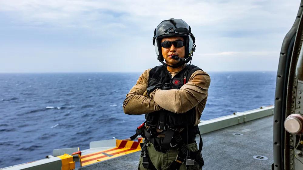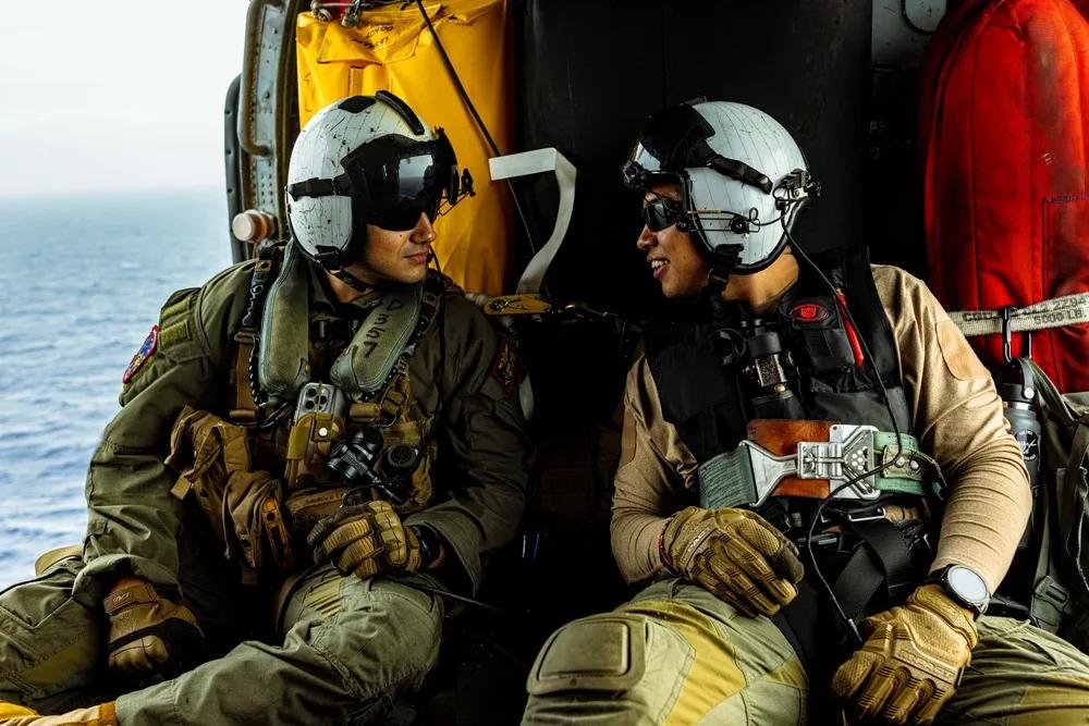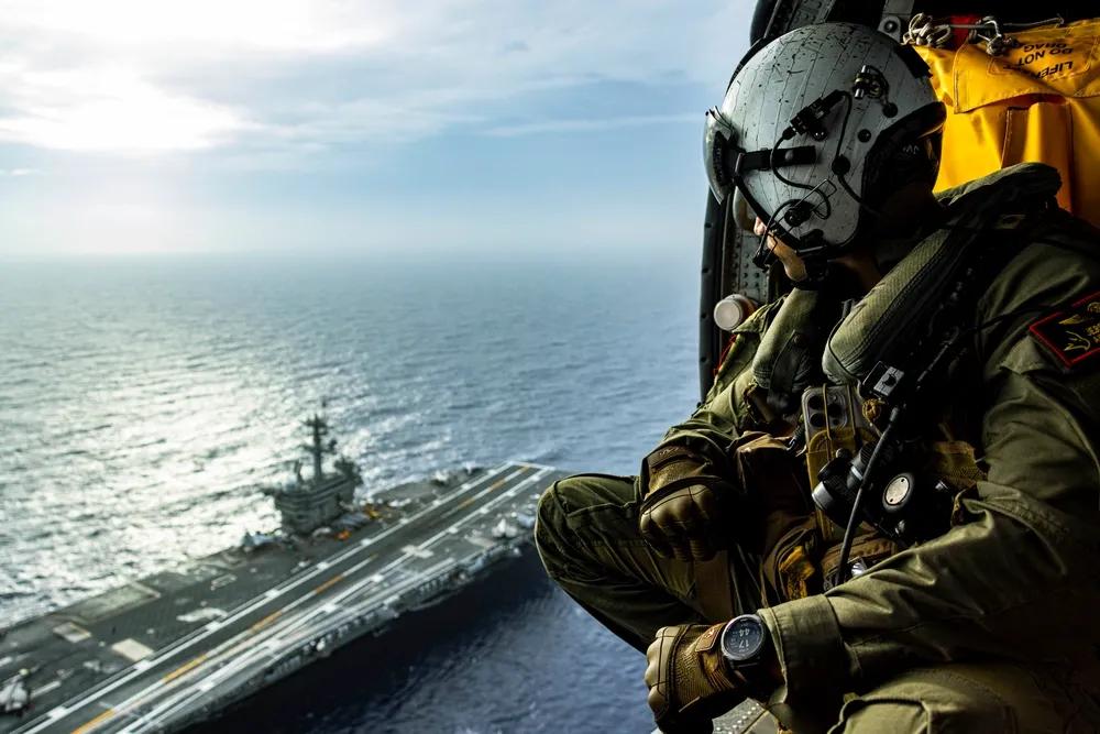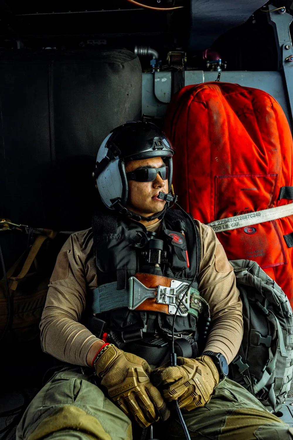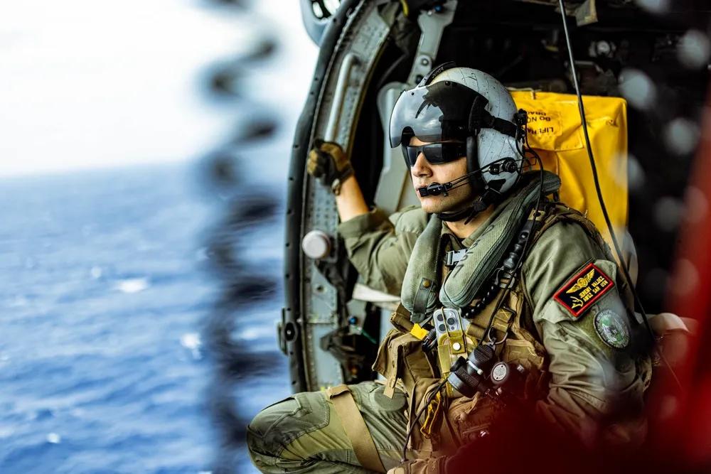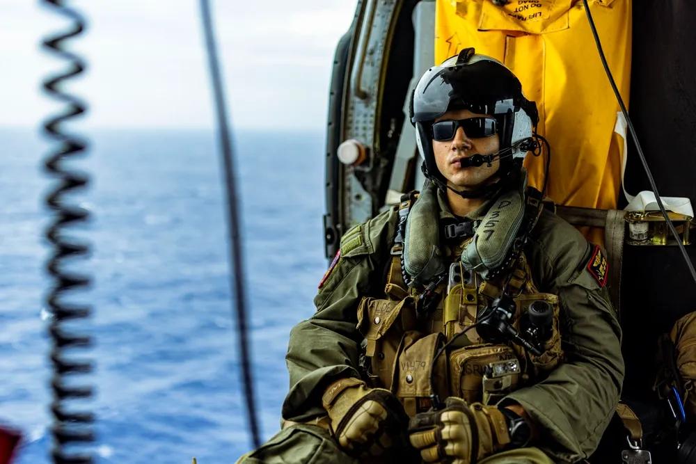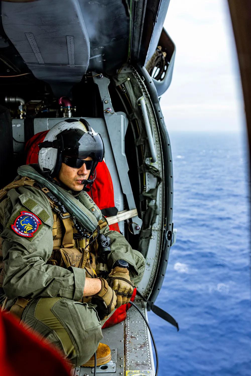 2025年6月15日,隶属于第12直升机海上作战中队(HSC)“金隼”分队,在MH-60S海鹰直升机上观察地平线,该直升机在航行于菲律宾海时与尼米兹级航空母舰乔治·华盛顿号(CVN 73)并行。乔治·华盛顿号航母打击群(GWA CSG)正在美国第七舰队作战区进行巡逻。乔治·华盛顿号是美国海军的旗舰前沿部署航母。