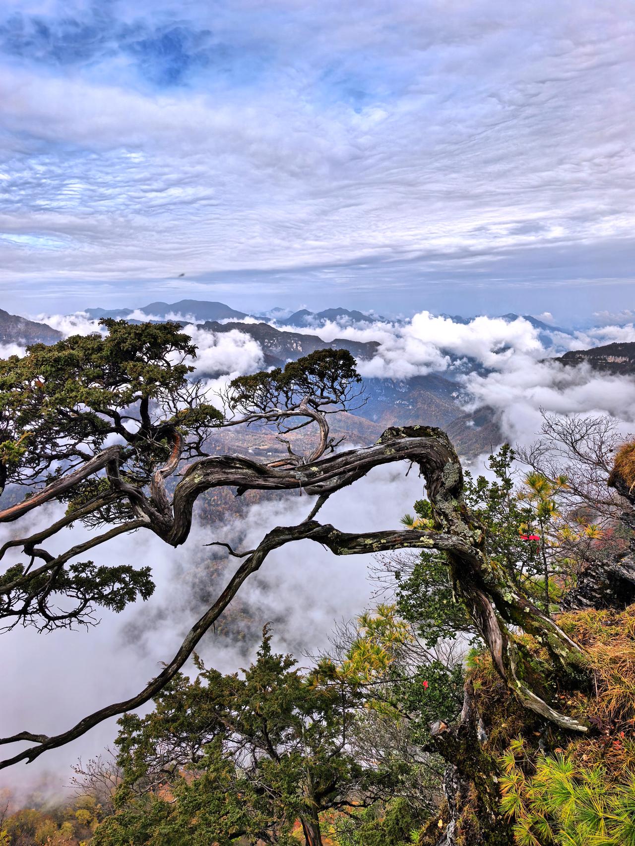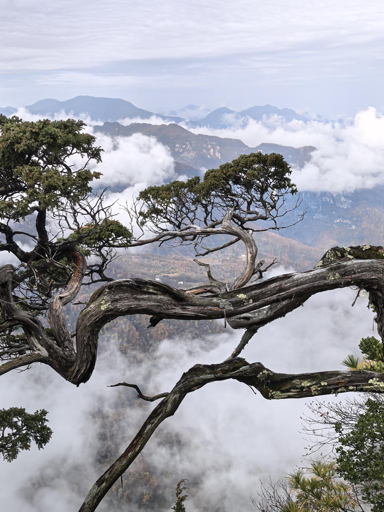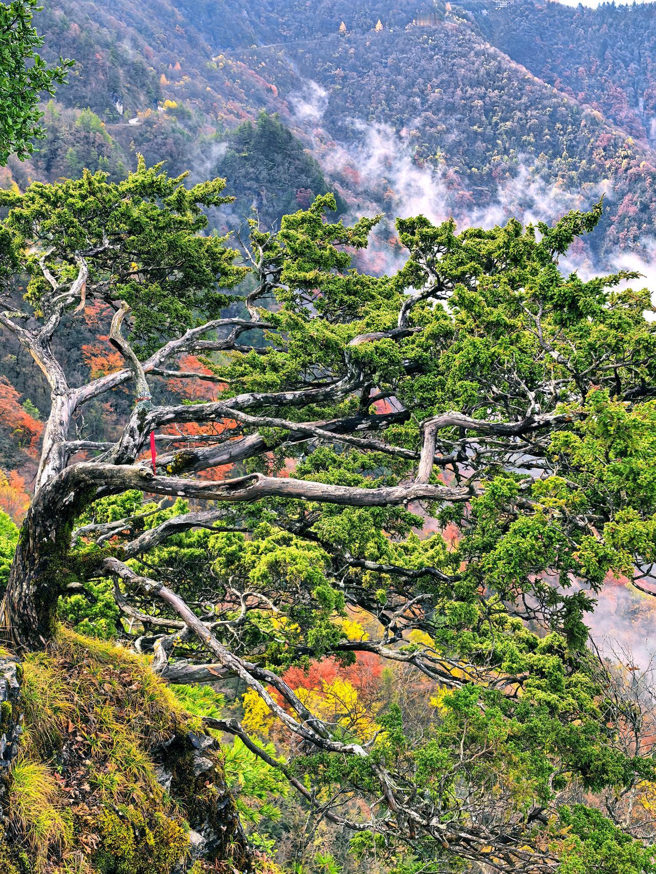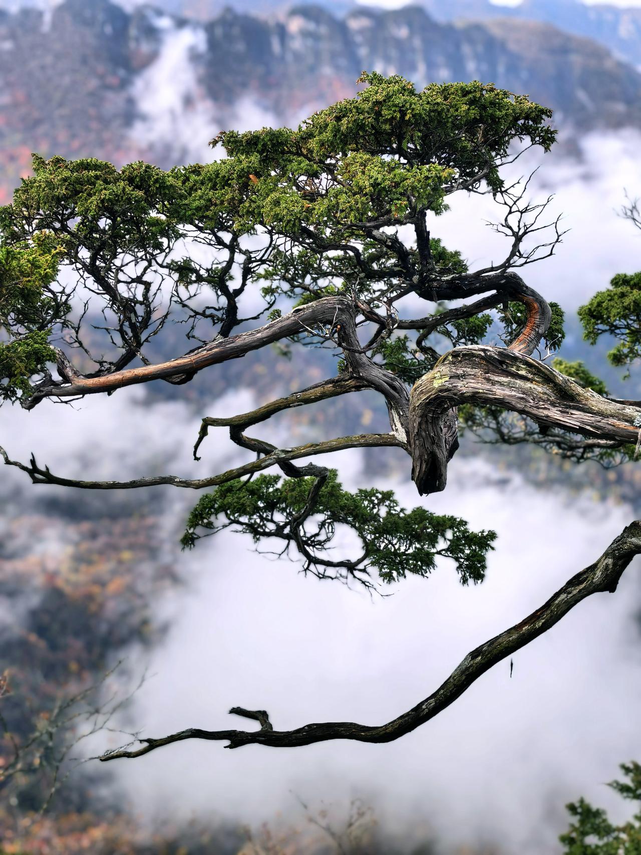 在神农架天燕景区,海拔2000多米的绝壁悬崖上,几棵古老的苍松傲然挺立。这里没有土壤,只有铁色的绝壁和坚硬的岩石。然而,这些顽强的生命却从石髓中挣出躯干,根如鹰爪般深深钳入岩芯,展现出惊人的生命力。面对仅有寸宽的岩缝,它们以岁月为凿,一寸寸抠出自己的疆土;在无土的云崖之上,它们以针叶为笔,一笔笔书写着绿色的史诗。 深秋时节,斑斓的远山与这几棵古松相映成趣。远山上红、黄、绿交织成一片绚丽的色彩,仿佛是大自然最得意的画作。而那几棵古松,则像是这幅画卷中的点睛之笔,为整个画面增添了几分坚韧与不屈的气息。站在这高高的悬崖边,望着眼前的景象,不禁让人感叹于自然界的鬼斧神工以及生命所蕴含的力量之美。
