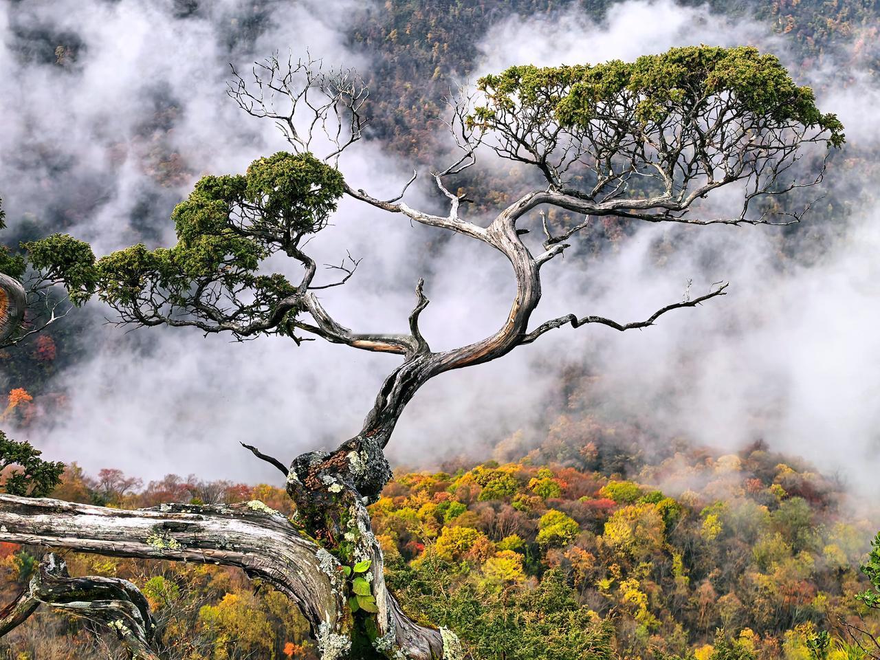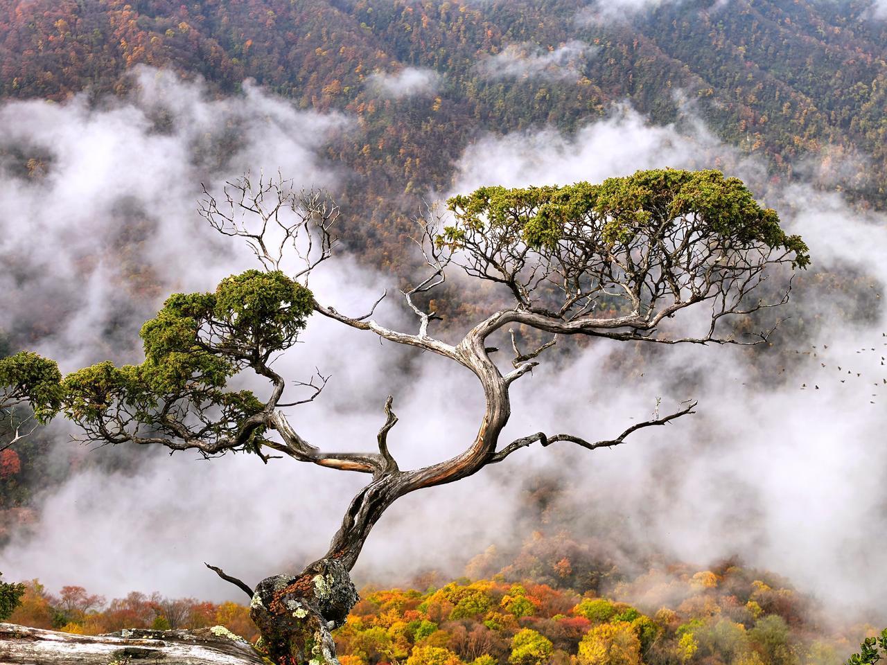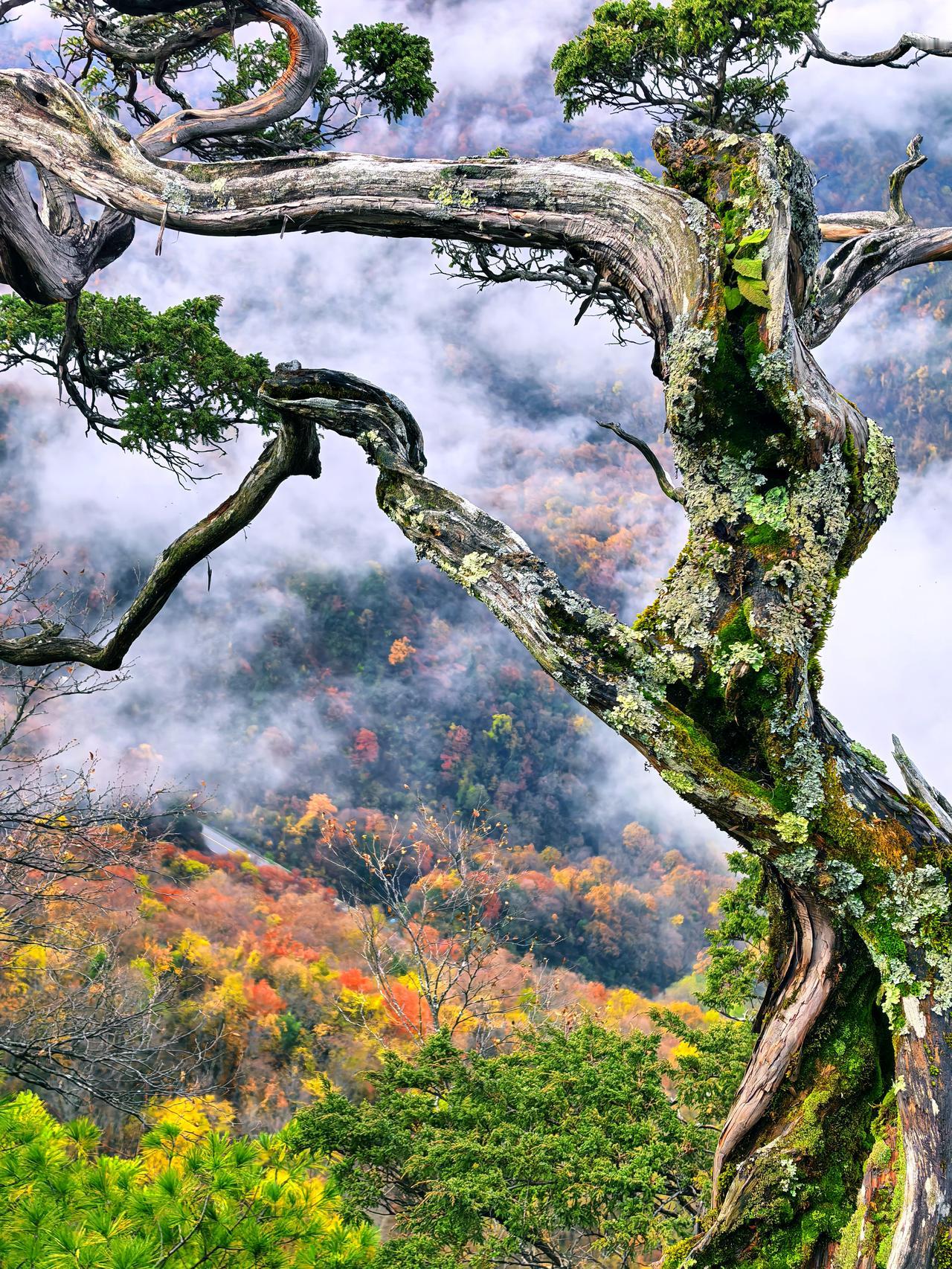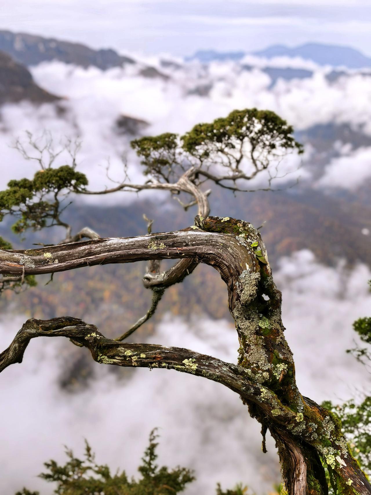 在神农架天燕景区,海拔2000多米的绝壁悬崖上,几棵古老的苍松傲然挺立。这里没有土壤,只有铁色的绝壁和坚硬的岩石。然而,这些顽强的生命却从石髓中挣出躯干,根如鹰爪般深深钳入岩芯,展现出惊人的生命力。面对仅有寸宽的岩缝,它们以岁月为凿,一寸寸抠出自己的疆土;在无土的云崖之上,它们以针叶为笔,一笔笔书写着绿色的史诗。 深秋时节,斑斓的远山与这几棵古松相映成趣。远山上红、黄、绿交织成一片绚丽的色彩,仿佛是大自然最得意的画作。而那几棵古松,则像是这幅画卷中的点睛之笔,为整个画面增添了几分坚韧与不屈的气息。站在这高高的悬崖边,望着眼前的景象,不禁让人感叹于自然界的鬼斧神工以及生命所蕴含的力量之美。