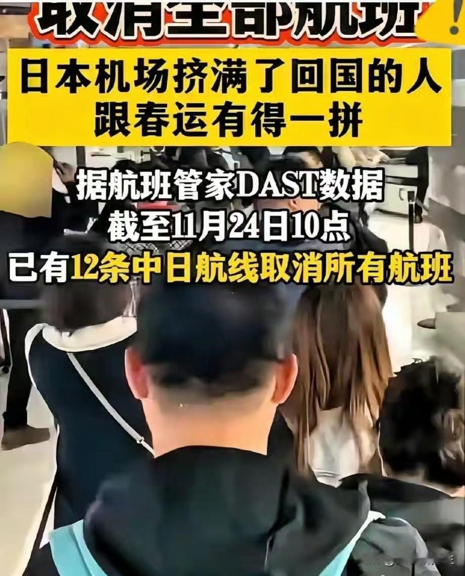 问这两天在东京成田机场送机的朋友: 航班取消那么多,机场得空荡荡的吧? 他发来的视频直接看懵了我! 值机柜台前绕了好几圈的队伍,全是拖着大箱小箱的同胞,有人盯着手机刷新机票价格,有人蹲在墙角抓紧改签。声音嘈杂,但耳边飘过的中文比日语还多。这阵仗,不像普通出行,倒像年底春运提前了。 其实早在月初,外交部、文旅部就接连发了安全提醒,建议谨慎赴日。可那时不少人还觉得“没事”,直到航线真的开始砍——12条中日航班说停就停,机票价格翻着跟头涨,才发觉形势比想象中紧。 回头想想,这股回国潮不全是恐慌,更多是现实掂量后的选择。日元跌到低谷,买菜吃饭都肉疼;当地治安案件频出,破案率却低得让人心慌。再加上签证费明年可能大涨,谁不想趁早往回赶? 但有意思的是,也有人不退反进。羽田机场偶见几个举着小旗的旅行团,导游喊着“红叶季最后一批”,游客照样按计划登机。仿佛两条平行线,一边是归心似箭,一边是“旅游不理政事”。 可普通人的日子,哪经得起反复折腾。航线恢复不知何时,退改签政策却已逐步收紧。那些还在观望的,或许不久后也会加入机场长队。毕竟安全感这东西,平时不觉得,一旦摇了,心里就只剩一个念头:早点回家。