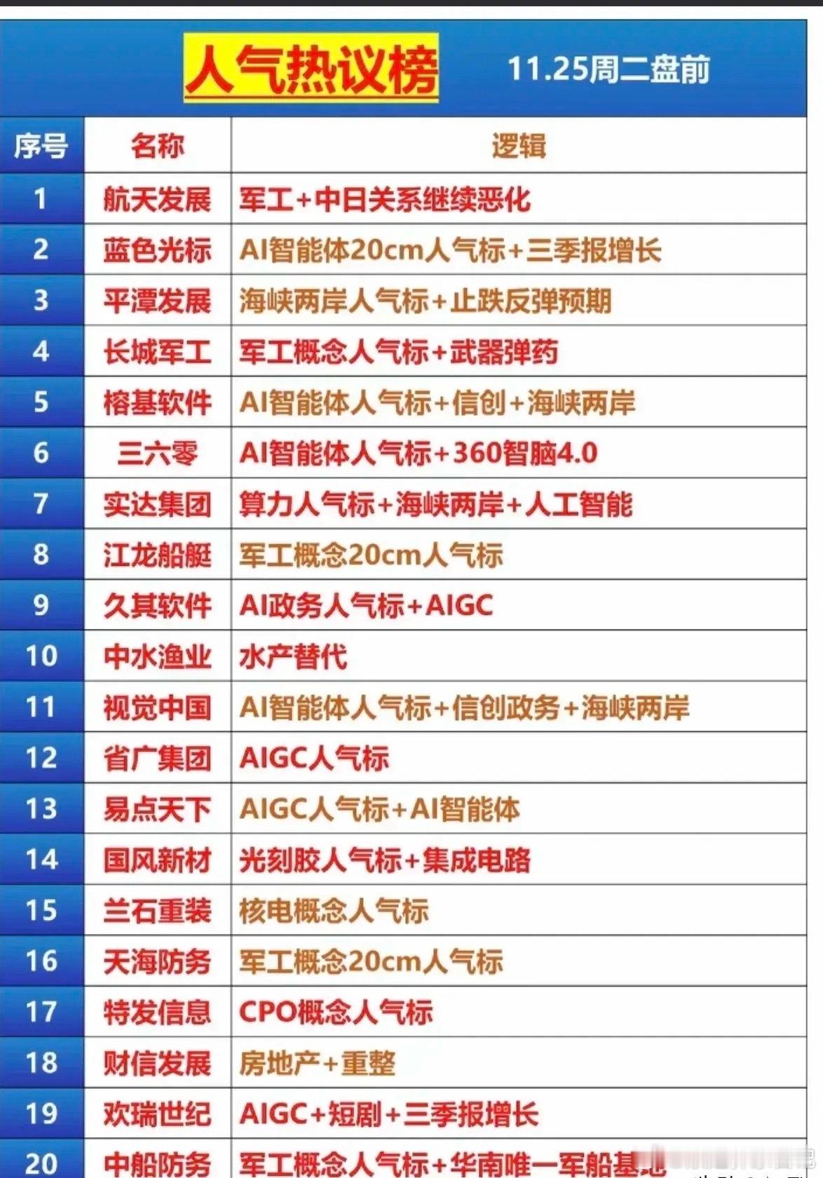 11.25周二盘前人气榜|聚焦军工/AI/海峡两岸热点标的人气标的梳理1. 航天发展:军工情绪标,地缘事件催化,无基本面支撑,板块退潮波动放大2. 蓝色光标:AI智能体20cm人气标,叠加三季报增长,情绪+基本面双支撑,韧性较强3. 平潭发展:海峡两岸情绪修复标,地域关联属性,受益逻辑弱,看反弹延续性4. 长城军工:军工传统情绪标,沾地缘热度,无新基本面增量,随板块情绪波动5. 榕基软件:AI+信创+海峡两岸多概念叠加,业务融合浅,纯情绪驱动6. 三六零:AI智能体熟标,技术迭代加持,商业化变现慢,靠赛道热度支撑7. 实达集团:算力+海峡两岸+AI,算力契合需求,业务布局不明确,概念炒作8. 江龙船艇:军工20cm弹性标,聚焦舰艇,有订单预期,业绩贡献需时间验证9. 久其软件:AI政务+AIGC,亏损收窄,落地节奏慢,靠赛道情绪与政策预期10. 中水渔业:水产替代标的,事件驱动,替代规模与持续性不明,热度退潮易回调11. 视觉中国:AI+信创+海峡两岸,AI赋能内容,业务受多重因素影响,概念炒作12. 省广集团:AIGC人气标,关联谷歌代理,行业竞争烈,赋能效果待验证13. 易点天下:AIGC+AI智能体,聚焦海外营销,受汇率与市场环境影响,情绪标的14. 国风新材:光刻胶+集成电路,事件催化,技术与产能不足,纯概念炒作15. 兰石重装:核电人气标,沾政策预期,项目落地周期长,无实质利好16. 天海防务:军工20cm弹性标,业务规模小,业绩不稳,随板块情绪波动17. 特发信息:CPO人气标,关联谷歌供应商,业务占比低,靠算力赛道热度18. 财信发展:地产+重整,政策情绪加持,行业承压,重整进度存疑,超跌反弹标的19. 欢瑞世纪:AIGC+短剧+三季报增长,赛道热点+基本面支撑,落地效果待看20. 中船防务:军工扎实标的,军船基地属性,地缘催化+基本面支撑,预期稳健总结盘前人气标的以短期情绪驱动为主,绑定地缘、AI、海峡两岸等热点,仅蓝色光标、欢瑞世纪、中船防务等少数标的有基本面点缀。资讯源自网络公共信息,仅供参考,不构成投资建议📈