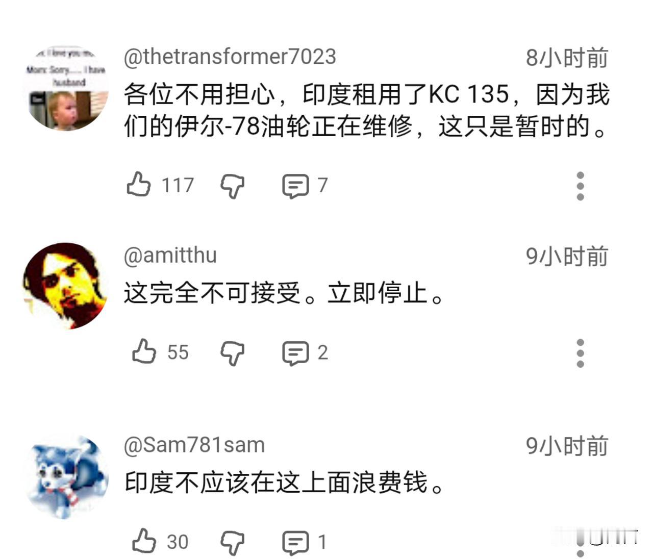 有加油机,却不能使用!印度网友破防。 据一位印博主11月23日透露,印度在获得了KC135加油机后,在战时不能使用,甚至是不得起飞。 众所周知,购买老美家的武器有着诸多的条件,就连在使用时都得得到对方允许。例如,在“5.7”空战时,由于老美的不同意,巴空军的F16战机就没有出动。 闻讯后的印网友自然不能接受。他们认为,既然把武器卖给了印度,就不应该限制其使用。 也难怪印网友会不淡定,一直以来都将自己视为军事强国和唯一可以与中美竞争的超级大国…