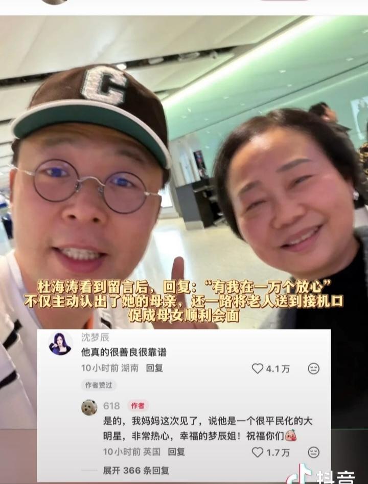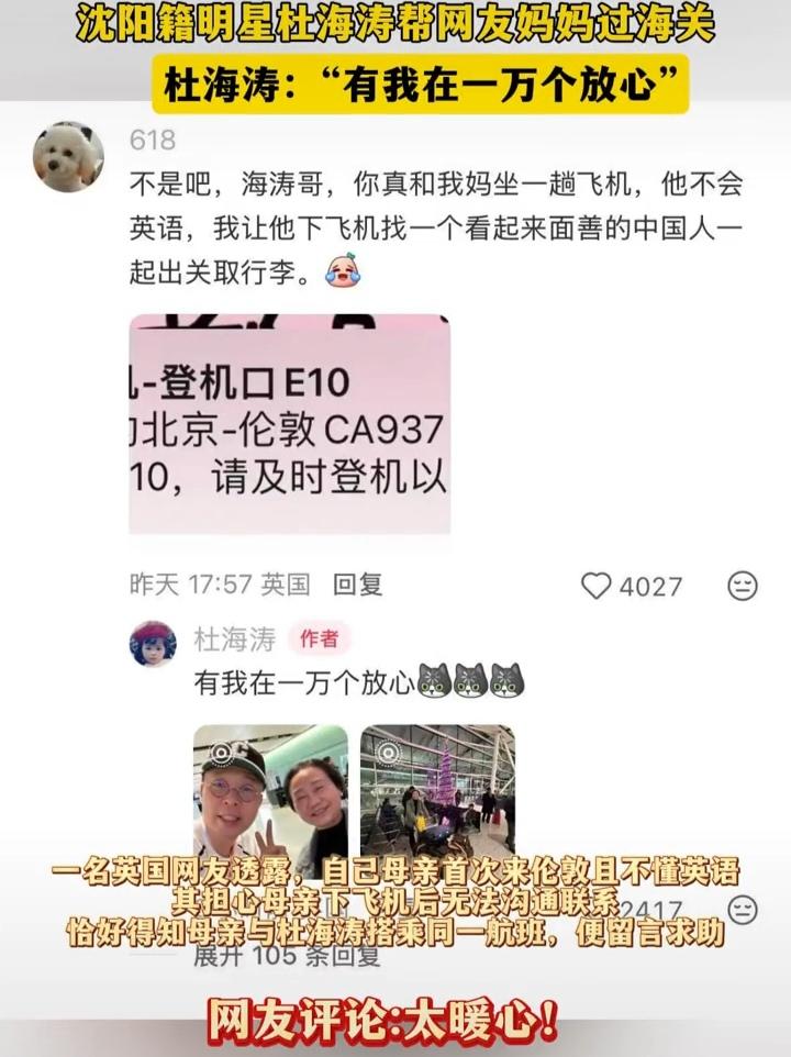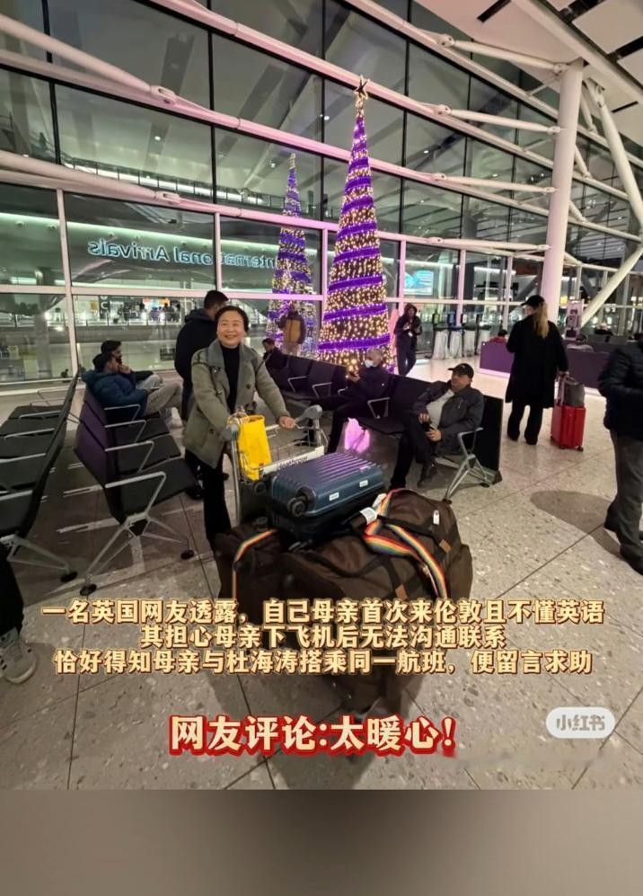 一觉醒来,杜海涛登上了热搜。不是因为主持某个综艺节目,也不是因为演了某部电影,而是因为在伦敦机场帮助网友找妈妈。 一位网友说,他的妈妈独自一个坐飞机去伦敦。妈妈不会英语,她给妈妈买的英国电话卡,妈妈也不会激活。到了伦敦机场妈妈就失联了。 他刷小红书看到杜海涛正好和妈妈一趟航班,就抱着试试的心态,给杜海涛留言让他帮忙找妈妈。没想到杜海涛很快就回复他了。不仅帮他找到了妈妈,还帮阿姨看行李,最后直接把阿姨送到接机口。 网友妈妈开始以为是网友的同学,后来才知道是个大明星。妈妈说,杜海涛真的很热心,一点架子都没有。 杜海涛在圈子的评价一直都很好,都说他是一个善良热心的人。 作为大明星,能够第一时间看到网友的留言,帮助网友,确实也不容易。感谢善良的海涛,感谢所有在别人有困难时伸出援手的人们。帮助了他人,也快乐了自己。
