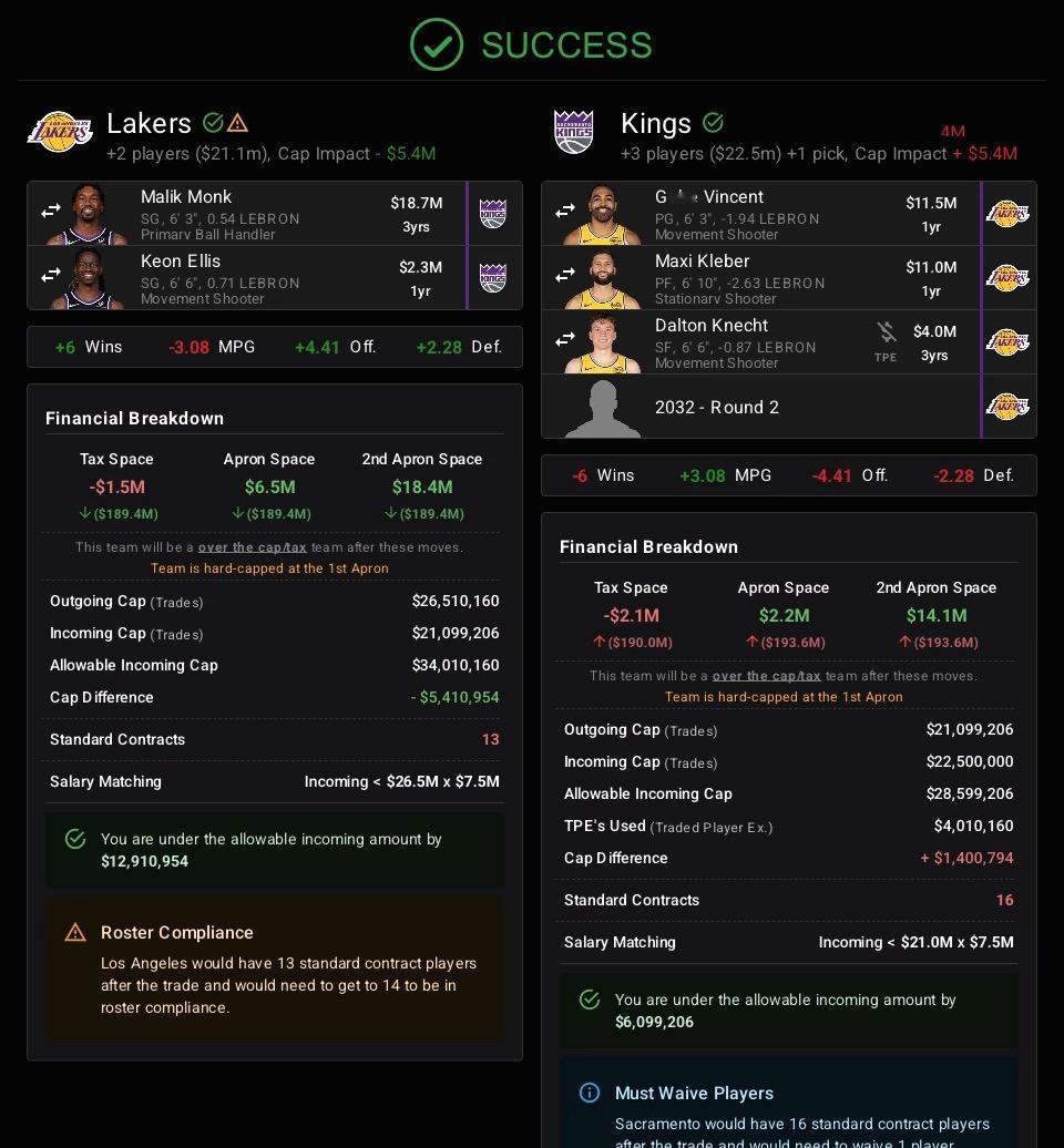湖人队场均替补得分25.3分依然联盟垫底,如果湖人的交易目标是艾利斯,那么艾利斯+蒙克(一攻一防)组合交易非常诱人。 蒙克本赛季替补出战14场,场均12.4分1.7板2.1助攻,投篮命中率44.7%,三分43.3%。增强替补得分本身也是给首发减负的操作。 国王与湖人之间上一次接近交易是2021年休赛期。佩林卡,用库兹马+哈雷尔交易国王希尔德,结果让威少给扼杀了。 湖人得到:艾利斯+蒙克 国王得到:文森特+克莱伯+克内克特+次轮