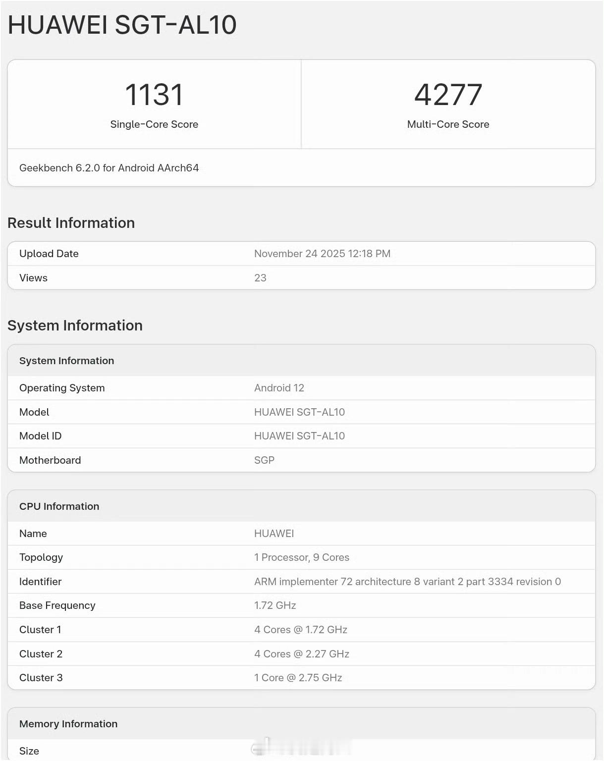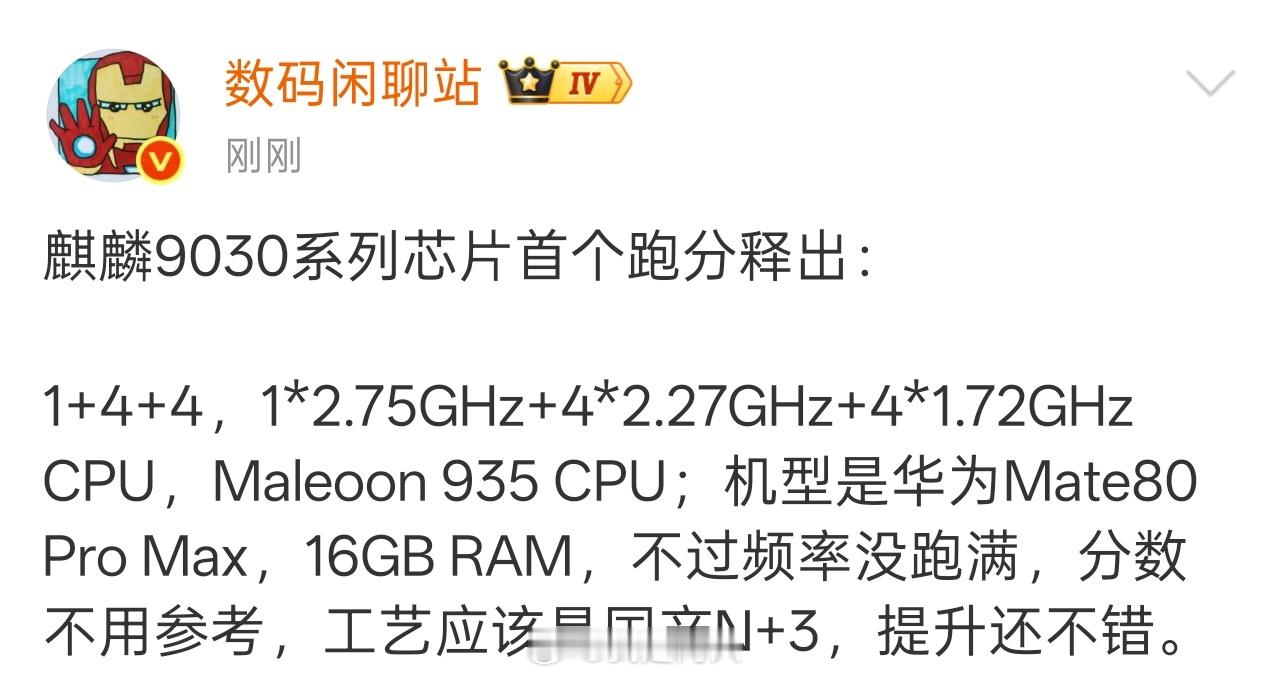 麒麟9030跑分出来了单核1131,多核4277,采用1+4+4架构,1*2.75GHz+4*2.27GHz+4*1.72GHz, Maleoon 935 GPU;机型是华为Mate80国产N+3工艺,提升还不错。
