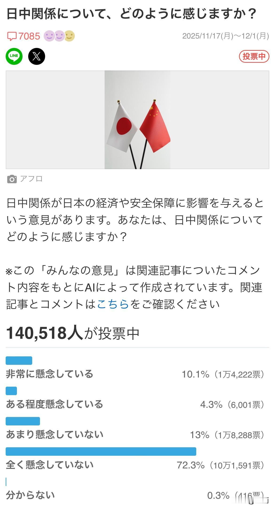 日本雅虎在网上搞了一个关于中日关系是否会影响日本的经济和安全的投票。让日本网民进行投票。 从11月17日开始的投票活动目前已经吸引了14万人次的投票。其中,72.3%的人认为完全不担心会受到影响,不太担心的占13%。也就是说85%以上的日本人不担心中日关系不会对他们的经济和安全产生影响。 只有15%的人对此感到担忧。