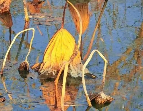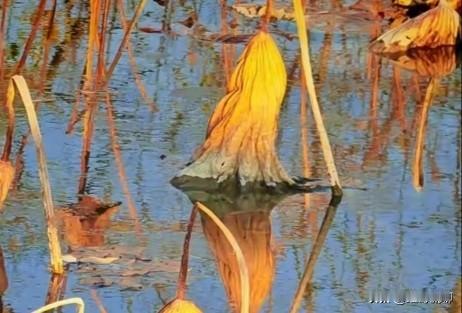 白露凋花花不残, 凉风吹叶叶初干。 无人解爱萧条境, 更绕衰丛一匝看。 我览古诗尽伤感, 惟爱白公察物言, 叶无圆影柄无香, 枯荷之美在自然。