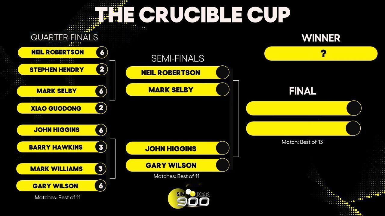 克鲁斯堡杯 肖国栋不敌马克·塞尔比无缘四强! 11月24日,首届克鲁斯堡杯开杆,1/4决赛战绩如下: 尼尔·罗伯逊6-2斯蒂芬·亨德利 马克·塞尔比6-2肖国栋 约翰·希金斯6-3巴里·霍金斯 加里·威尔逊6-3马克·威廉姆斯 今日的半决赛对阵: 尼尔·罗伯逊 VS 马克·塞尔比 约翰·希金斯 VS 加里威·尔逊