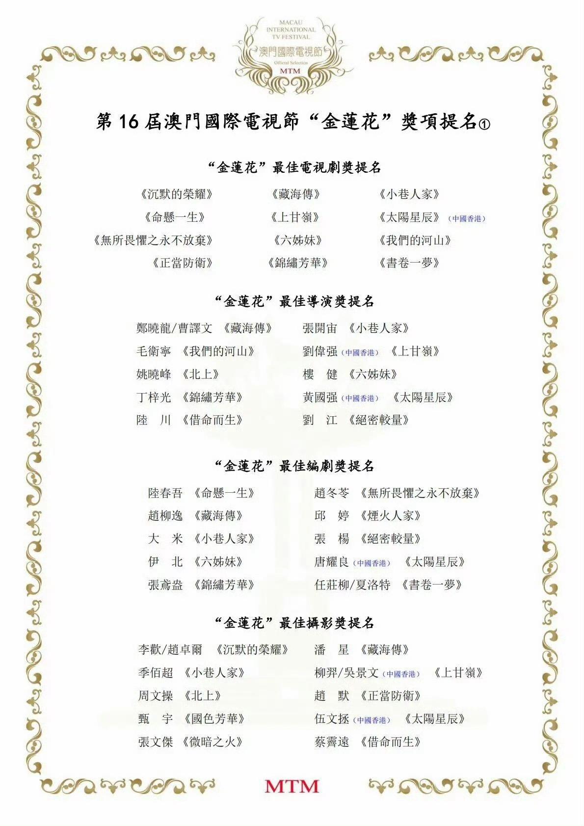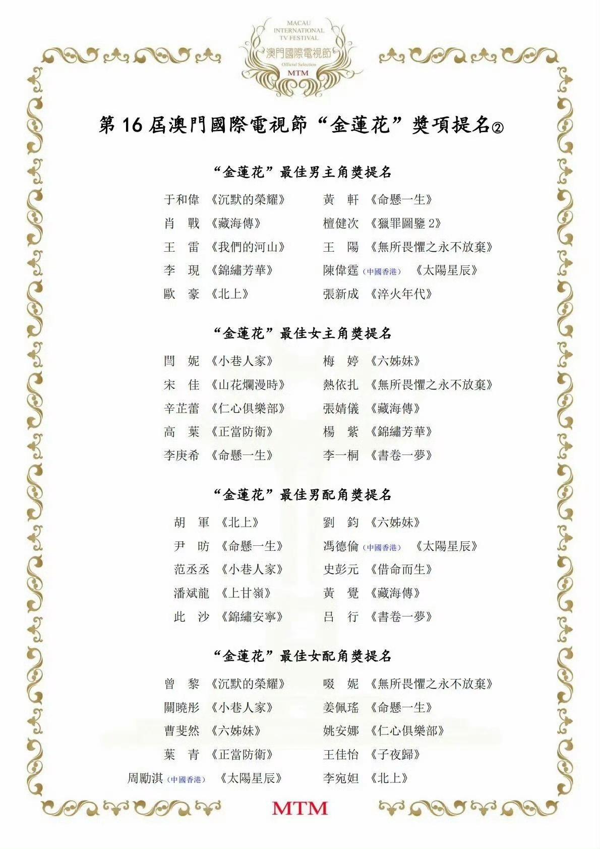 第十六届金莲花奖入围名单新鲜出炉,来看看你最看好谁? 我的预测如下: 最佳男主——于和伟/王雷 最佳女主——闫妮/宋佳 最佳男配——刘均 最佳女配——李宛妲 说实话,在这么多入围的电视剧里,就《小巷人家》《北上》《六姊妹》《沉默的荣耀》追完了,你呢?