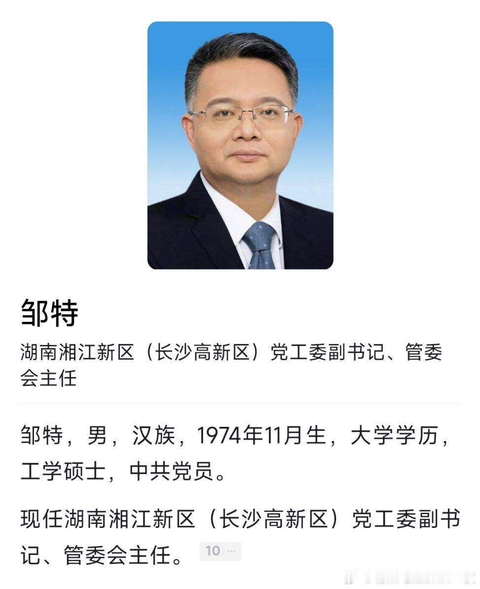 邹特已任湘江新区(长沙高新区)党工委副书记、管委会主任。