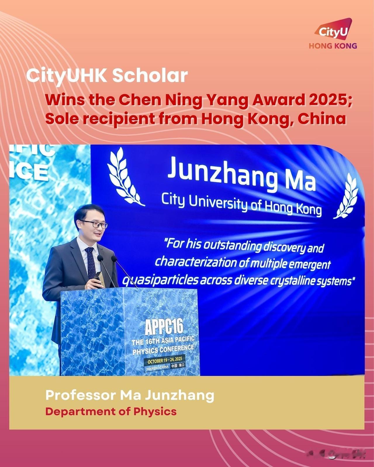 据《香港文汇报》报道,香港城市大学物理系副教授马均章,近日荣获由亚太物理学会联合会(AAPPS)及亚太理论物理中心(APCTP)共同设立的2025年度「杨振宁奖」,是本年度唯一来自香港的获奖者。是次奖项表彰他在多种晶体系统中发现并表征多种新兴准粒子(quasi-particles)的突破性成就,认为其开创性研究成果,有助深化人类对量子材料的理解。 「杨振宁奖」每年仅颁予3名在物理领域作出重大贡献的青年科学家,旨在表彰杰出青年研究员,推动亚太区物理学发展,并促进全球科学进步,是亚太地区物理学界最具声望的荣誉之一。2025年度得主之一的马均章,于2021年加入港城大物理系,专注于拓朴材料、超导材料及低维关联材料的电子结构,并运用角分辨光电子能谱(ARPES)进行深入分析。 此前他曾获包括香港研究资助局「杰出青年学者计划」,及2024年亚太物理学会联合会凝聚态物理分会「青年科学家奖—银奖」等多个奖项。 体现凝聚态物理「多则异」原理 据AAPPS介绍,马均章近年成功在多种晶体系统中发现并表征了各类涌现准粒子,核心贡献包括:在碳化钨中发现三份量费米子及相关拓扑费米弧;发现自旋涨落诱导的磁性外尔费米子;发现磁性狄拉克费米子; 在具特定几何结构的「Kagome戈薇晶格」金属中发现理想且可调控的表面狄拉克费米子等,另其研究还延伸至凝聚态体系中由电子─电子、电子─玻色子耦合诱导的新型量子准粒子。 AAPPS形容,马均章的研究表明,凝聚态物理领域存在种类丰富、具有新颖物理特性的准粒子,且这些准粒子在未来量子技术中具有巨大应用潜力。其开创性研究成果不仅深化了人类对量子材料的理解,更体现凝聚态物理中「多则异(More is different)」这一深刻原理。 对能够获奖马均章表示深感荣幸,认为不仅是对其个人努力的肯定,亦是对整个研究团队以及众多合作者多年来不懈追求的认可,「我们将继续突破前沿,推动量子材料研究,并致力培育新一代科学人才,让香港在国际科研舞台上绽放光芒。」
