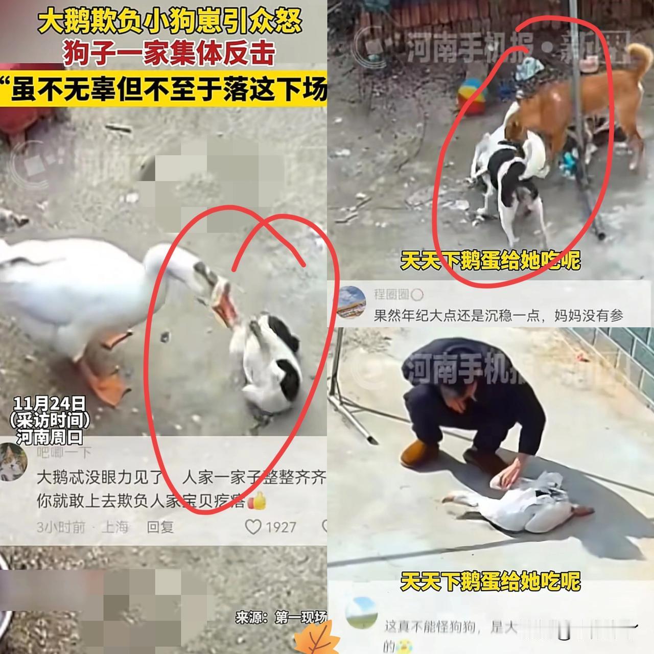 河南一女子办完事回家,发现自家大鹅死了!她以为家里进了贼,结果翻完监控直接傻眼——凶手竟是自家一窝狗子! 原来这大鹅平时在院里就是“霸王”,追得鸡鸭满天飞,这天更是仗着体型优势,对着奶狗疯狂啄咬,把小奶狗啄得“呜呜”直哭! 没等多久,狗妈妈带着两只半大狗子“呼”地冲出来,三犬合力围追堵截,短短三分钟,就把嚣张的大鹅收拾得没了气息! 大姐又气又心疼,直言大鹅“罪不至死”,但这事儿细品全是门道:大鹅的嚣张是没底线的霸凌,而狗子护崽是刻在骨子里的本能! 就像现实里那些总爱欺负弱小的人,总觉得对方好拿捏,却忘了再温顺的人,也有不能触碰的底线,一旦触怒,后果根本扛不住! 动物不懂分寸,可咱得拎清:霸凌从来没有“小打小闹”,每一次得寸进尺,都是在给自己埋雷! 你们觉得大鹅无辜吗?