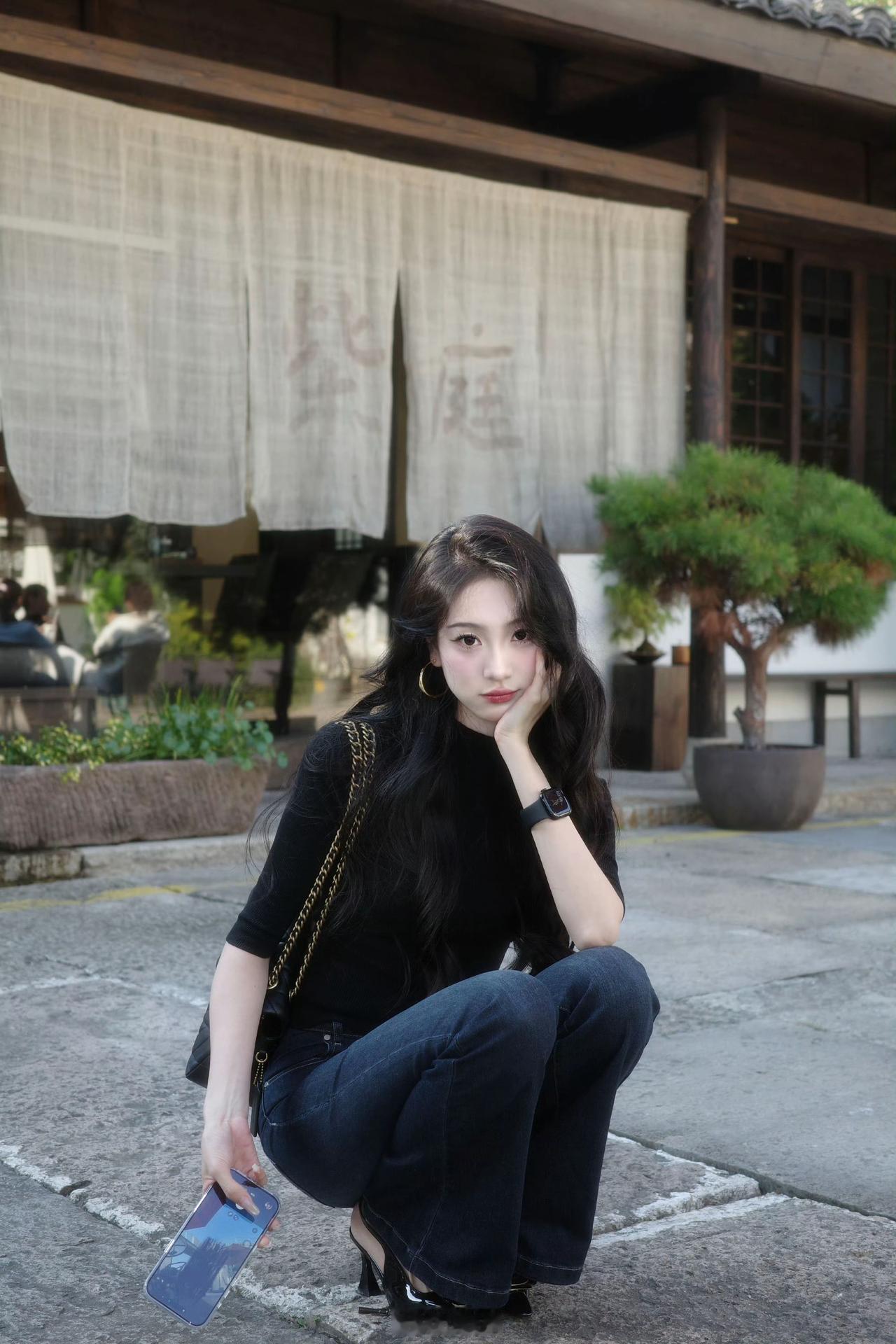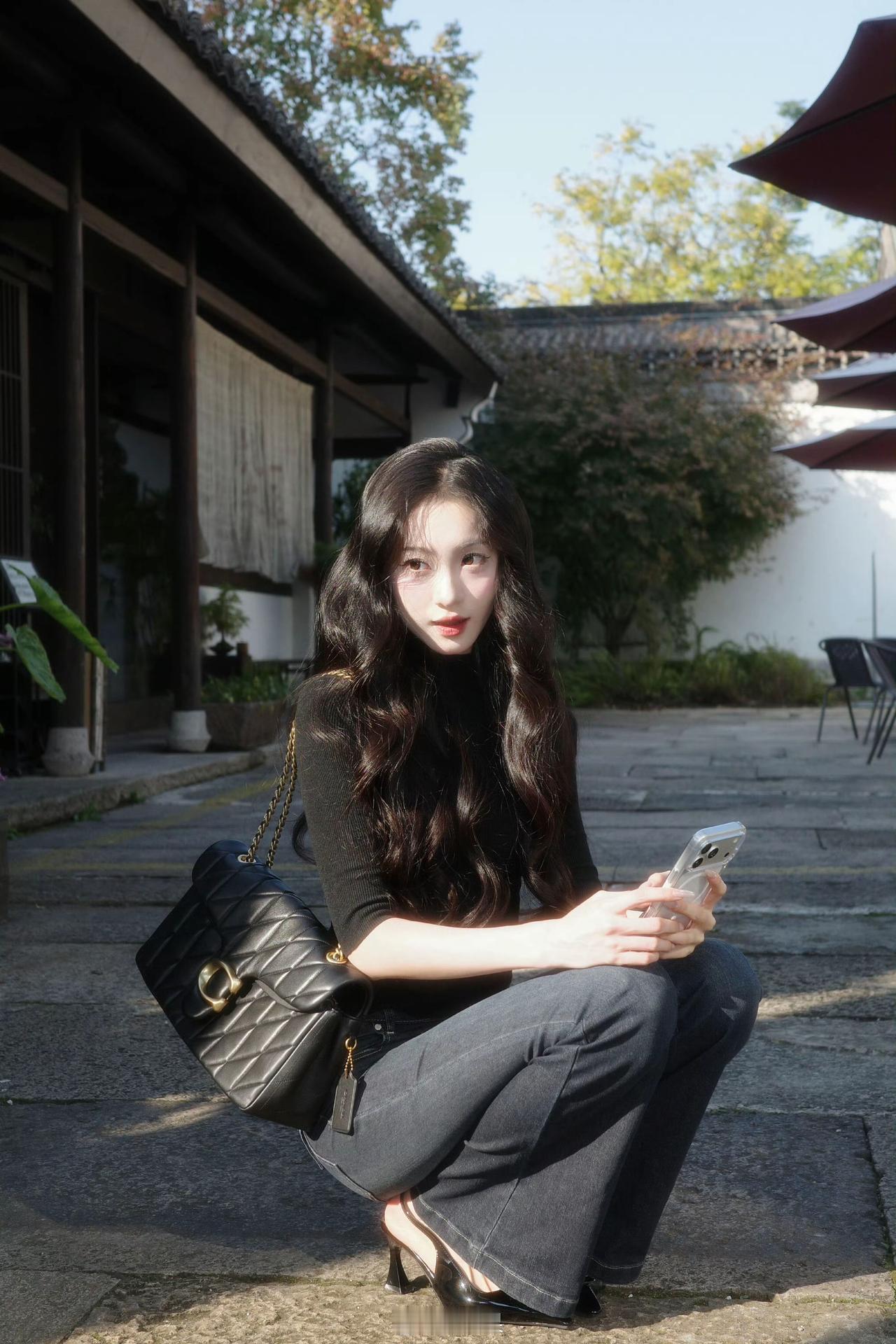 温柔白裙搭配针织开衫,石阶上的优雅时光